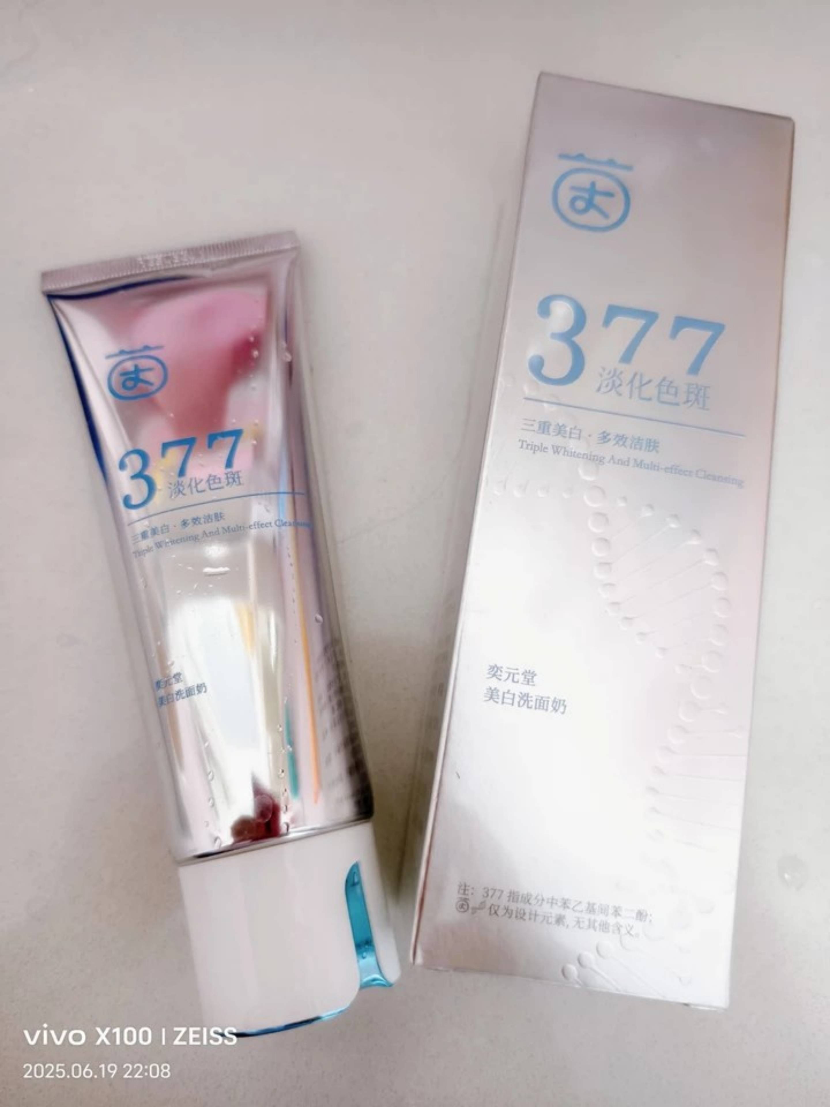 这款 377 氨基酸『美白』淡斑洁面乳,能深层清洁肌肤,去除油脂与污垢,让毛孔自由呼吸。它添加 377、烟酰胺等『美白』成分,从源头抑制黑色素生成,淡化顽固斑点,改善暗黄肤色。同时,氨基酸表活温和亲肤,不破坏肌肤屏障,洗后肌肤水润不紧绷。坚持使用,助你养出净白透亮美肌 。