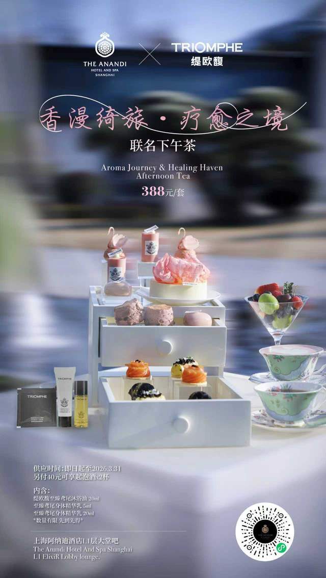 都市奢华疗愈标杆上海阿纳迪酒店,携手始于 1912 年的法国百年『香氛』品牌 TRIOMPHE缇欧馥,跨界推出「香漫绮旅・疗愈之境」联名下午茶与情人节主题客房。双方以TRIOMPHE缇欧馥 “三重感官美学” 与阿纳迪 “身心疗愈” 为核心,融合法式浪漫香韵与东方静谧松弛,为都市精致人群打造覆盖多感官的沉浸式体验。