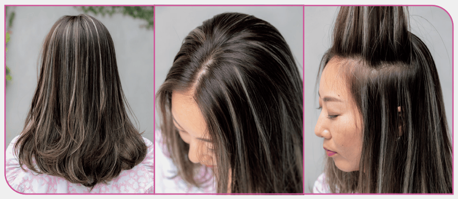 发根处若隐若现的白头发完美隐身。根据『长发』优势,通过加粗发梢处的高光,减少头顶和表面的高光,打造既有光泽感又优雅的造型。