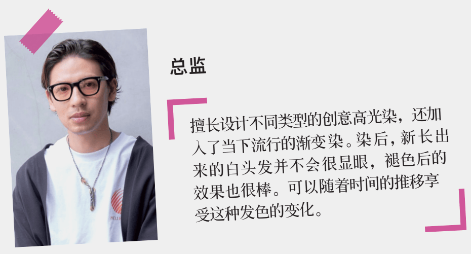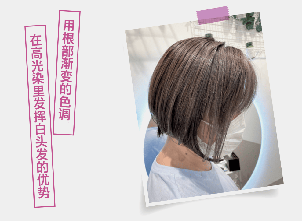 对头盖骨附近的头发进行创意高光染,突出了高光的效果,不会让人觉得这是为了掩盖白头发,可以打造出时尚的氛围感。