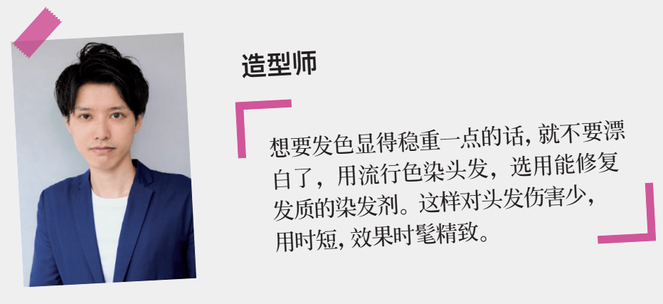 可以根据季节的变化,选择火山灰色、粉色、米驼色、灰米色等颜色。越是明亮的发色,可操作的范围就越大,搭配起来也就越开心。