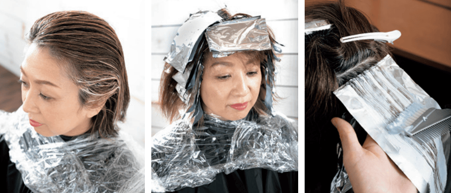 尽可能从接近发根的地方开始,每根发丝都打上高光色。根部的白头发染成渐变色,这样即使后面长长了也不会太过显眼。这个造型无法用染黑剂实现,但火山灰色却可以。