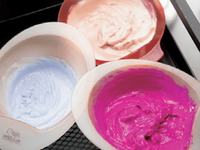 将3种颜色的染发剂分别涂抹于头发的不同部位,头发整体涂上粉红色的染膏, 给人一种妩媚的印象。脸部周围的头发加入高光色。