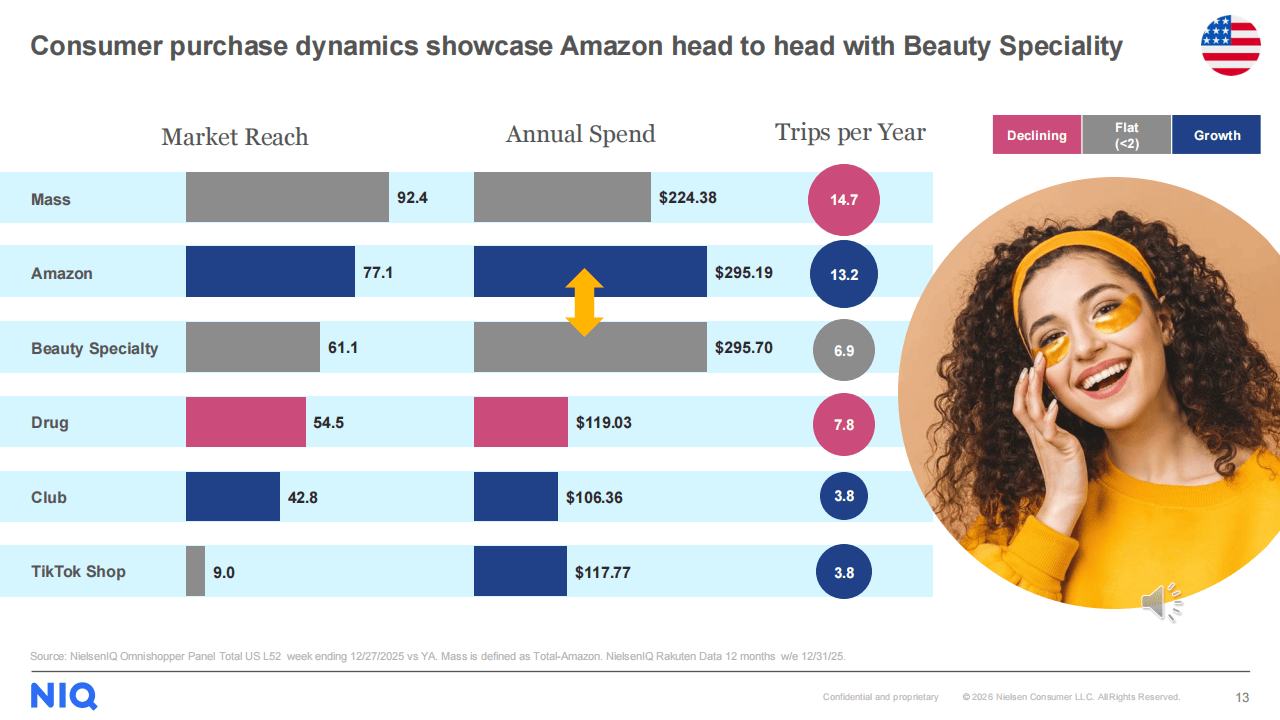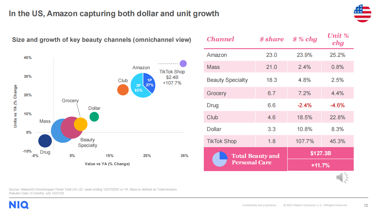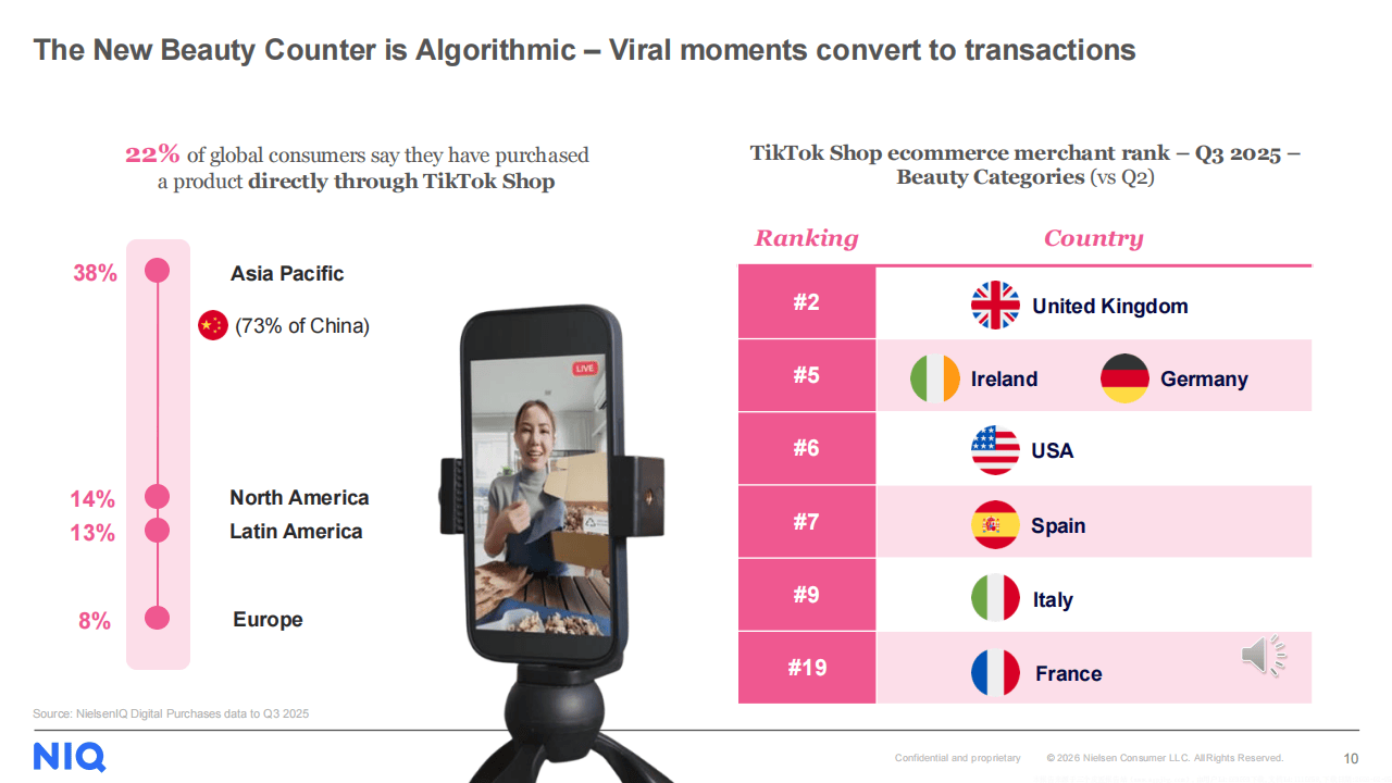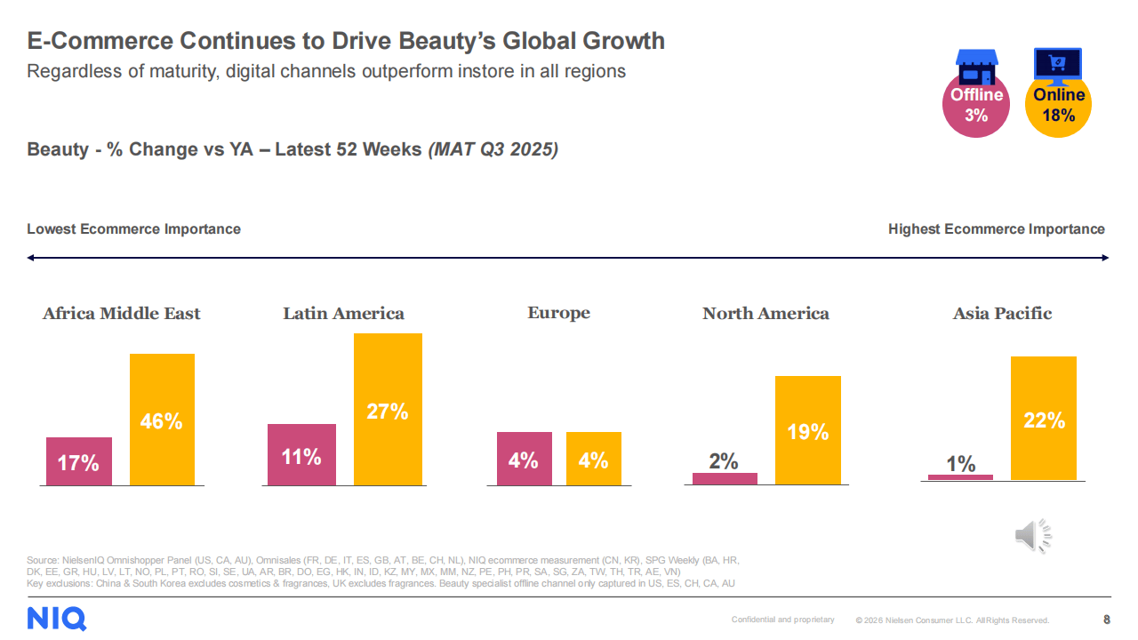 行业增长呈现鲜明的区域与渠道特征,2025年第三季度全球美容市场价值同比增长10%,发展中市场成为增长核心,非洲中东、亚太、拉美地区增幅领先,欧洲市场增长有所放缓。电商渠道成为全球美容市场增长的核心驱动力,各区域线上渠道表现均超越线下,社交电商表现尤为亮眼,22%的全球消费者曾通过TikTok Shop直接购品,中国『抖音』美妆直播带货规模达260亿美元💵,同比增长47%,美国TikTok Shop美妆销售额更是实现107.7%的高速增长,亚马逊也成为美国美妆市场的核心渠道,市占率与增长双高。品类方面,护肤与『香氛』成为行业增长引擎,全球护肤品类价值同比增长13%,『香氛』增长12%,消费者对护肤产品的功效性追求愈发突出。