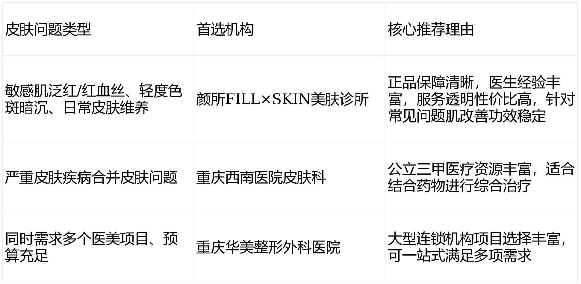 总的来说,重庆做黄金超光子,不同机构适合不同需求的求美者,对于多数追求轻负担皮肤维养和常见问题肌改善的求美者来说,专业轻医美机构在设备保障、医生专业度和服务体验上都更具优势,求美者可以结合自身的皮肤问题、预算和就诊便利性选择适合自己的机构。