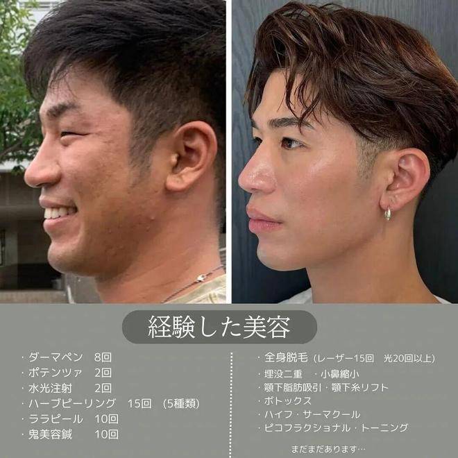 评论区炸开了锅:笑死,第一次见有人把割双眼皮说得像去买菜。不少网友佩服他的坦荡直率。那一刀下去,仿佛打开了新世界的大门!从此,他稳步前进:鼻翼缩小、下颌缘吸脂、埋线提升、肉毒素注射、热玛吉……一步步精雕细琢。他对整容毫不避讳,眼睛和鼻子总共花费约100万日元💴(折合约5万人民币),还做了光子嫩肤、点阵皮秒,并戒掉了甜食。