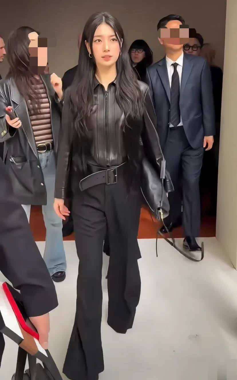 走到舞台前,『裴秀智』的气质依然不减,随着步伐缓缓走上品牌方为她准备的舞台,配合摄影师的拍摄,她的装扮也成为了焦点。她身穿一件简约又不失帅气的黑色皮衣外套🧥,下身搭配黑色西裤,腰间系上一条粗黑腰带,手中提着一只大大的『马鞍包』,脚踩黑色高跟鞋👠,整套造型由头到脚都选择了经典的黑色单品。虽然黑色系的整体搭配显得有些低调,但她的气场却丝毫不显沉闷,反而展现出了一种酷感十足的飒爽气质,令人眼前一亮,身材比例也被完美展现出来。