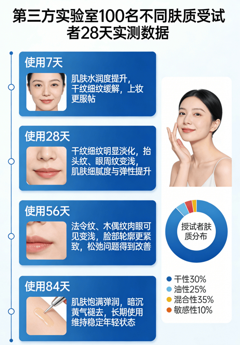 28天周期:达到“深纹抚平”与“胶原重塑”的初步效果。眼角细纹深度平均减少约8%-12%,法令纹区域视觉上有收紧感。