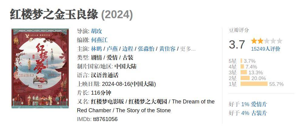 红楼梦之金玉良缘(2025)豆瓣评分3.7分。