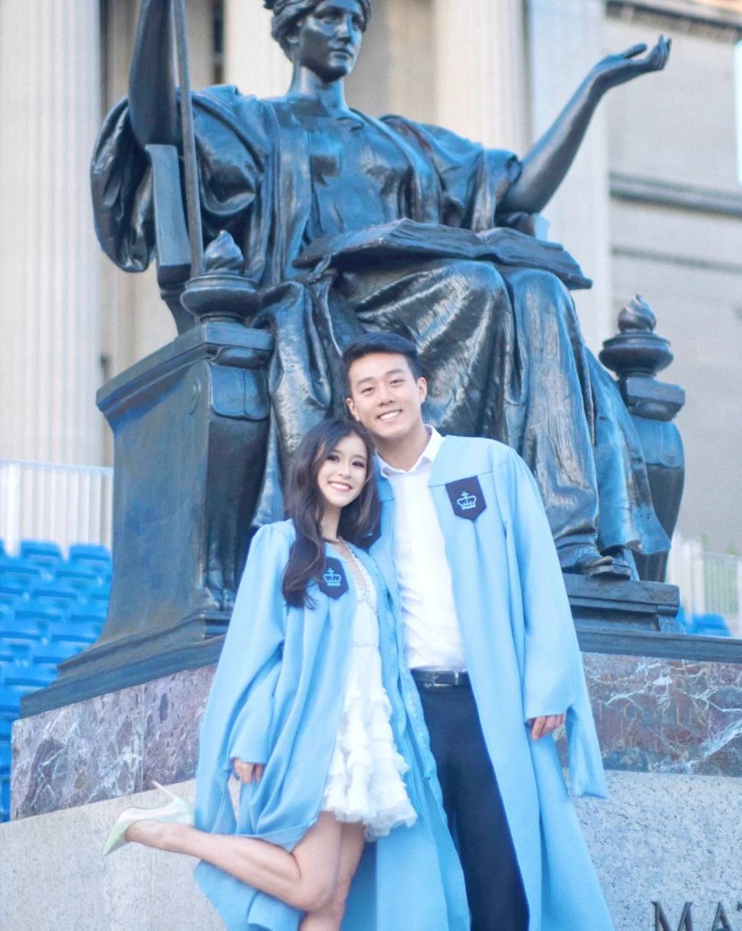 照片中,陈咏诗身穿一袭白色低胸短裙,搭配蓝色毕业袍,优雅地站在校园内,旁边是同样身着毕业袍的男友。两人手牵手,在哥伦比亚大学的多个经典场景前留下了温馨的合影。男友高大帅气的形象引发了网友们的热议,许多人称赞他“颜值堪比TVB男艺人”,可见二人情侣档的颜值也是不容忽视的亮点。