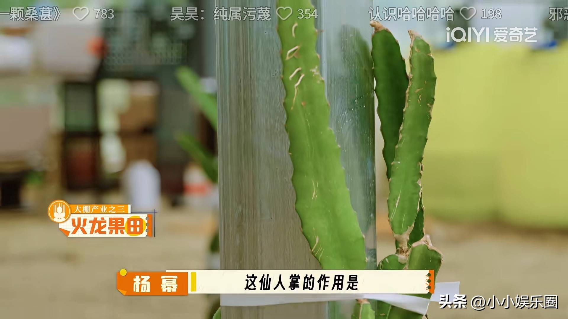 当他们来到火龙果的棚子前时,『杨幂』一时没有认出来,误以为是仙人掌,并好奇地问仙人掌有什么作用。弟弟们纠正她,告诉她那其实是火龙果,长得很像仙人掌。『杨幂』听后显得有些困惑,看来她对这些植物的认知确实有限。