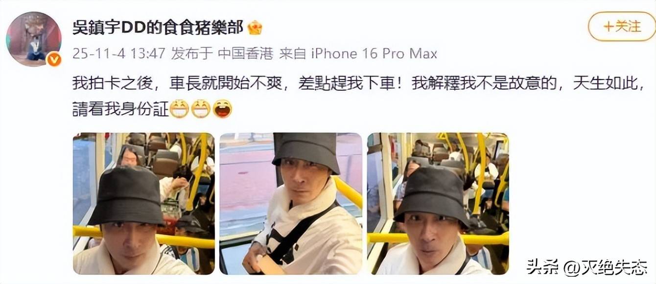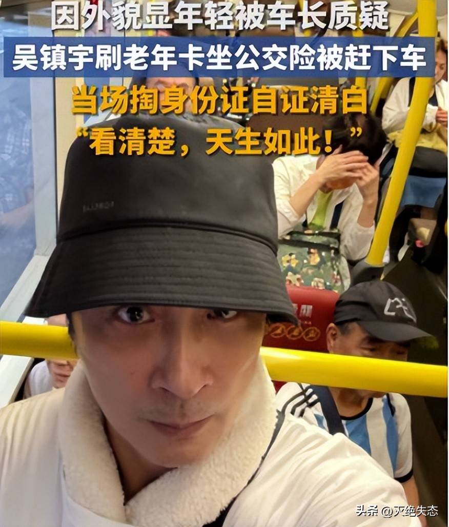 11月4日,吴镇宇在『社交平台』上分享了自己的一段经历,称因外貌过于年轻,他在乘坐公交时被怀疑“冒用他人证件”。这件事让他差点被赶下车,原因是他使用的是老年卡,而他看起来却像是年轻人,车长因此产生了怀疑。