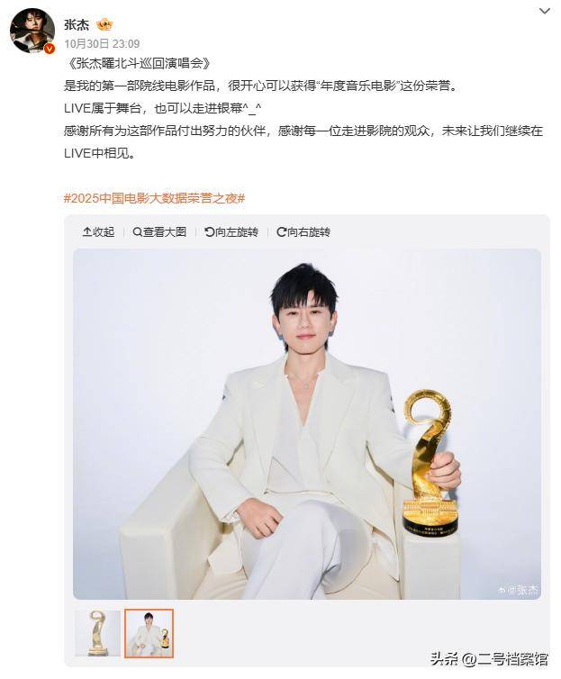 时至今日,『张杰』已经成为了舞台上不可忽视的存在。记得在他刚出道的时候,他给人一种瘦弱的印象,尽管歌声浑厚有力,却缺少了一些气场。如今,『张杰』已经完全改变了自己,身形健壮,肌肉结实,整个人显得更加阳光和有活力。尤其是在2023年10月30日,他在『社交媒体』上公布了自己获得奖项的喜讯,照片中的他穿着白色西装,坐在白色沙发上,满是自信与骄傲。这一奖项无疑是对他艺术成就的认可,证明了他将个人演唱会拍摄成电影的尝试取得了成功,即使观众不能亲临现场,也能在影院中感受到同样的震撼。