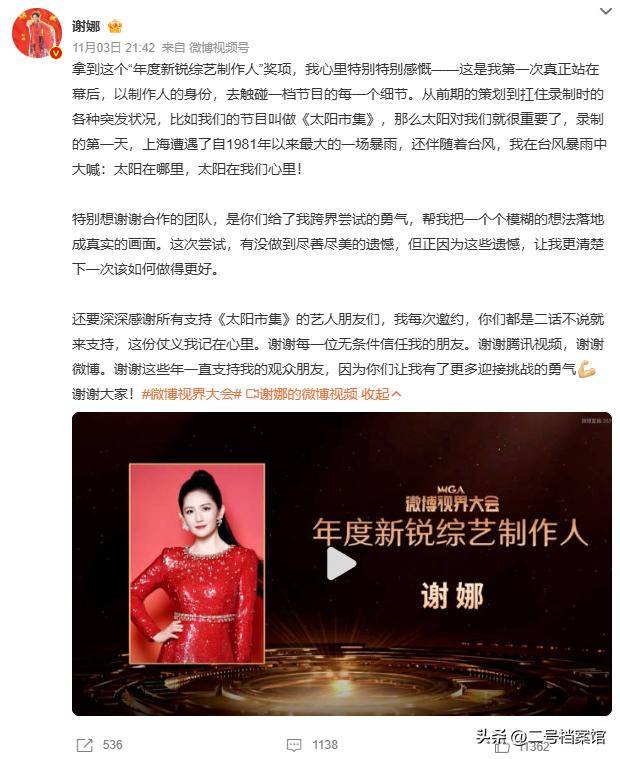 紧接着,『谢娜』的好消息也随之而来。11月3日,『谢娜』凭借自己制作的综艺节目《太阳市集》获得了年度新锐综艺制作人奖。作为主持人转型制作人,『谢娜』经历了多年的努力与积累,虽然运气也许是她成功的催化剂,但无可否认,她的努力是不可忽视的。尤其是在她与『张杰』相遇后,选择共度一生,也注定改变了她的人生轨迹。