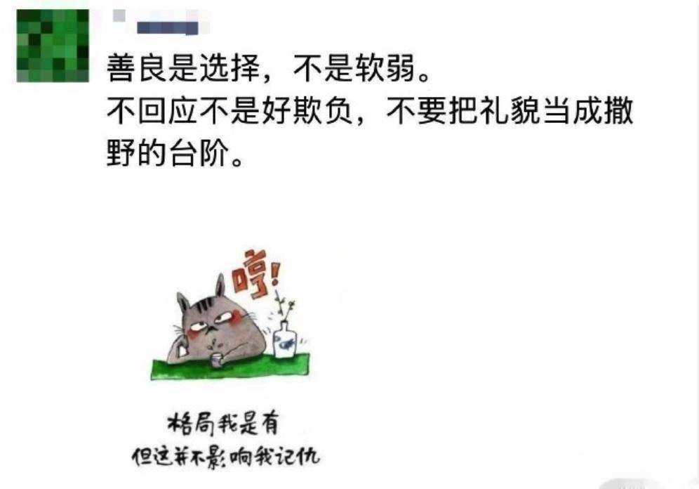 “善良是选择,不是软弱。不回应不是好欺负。格局我是有,但这不影响我记仇。”