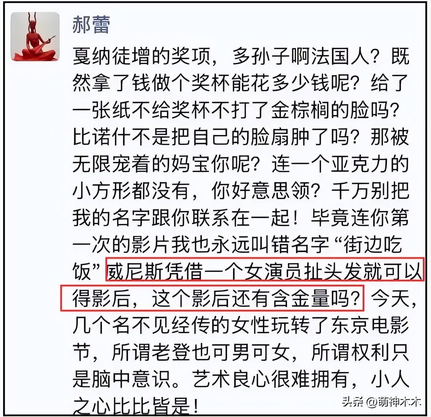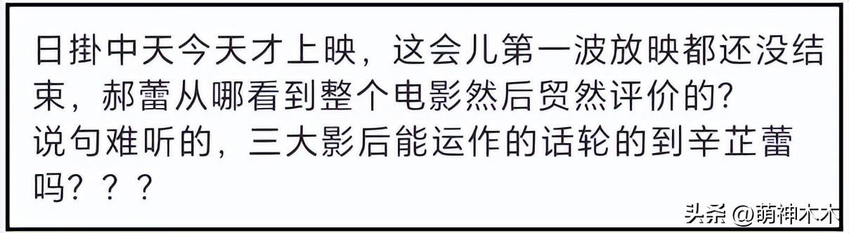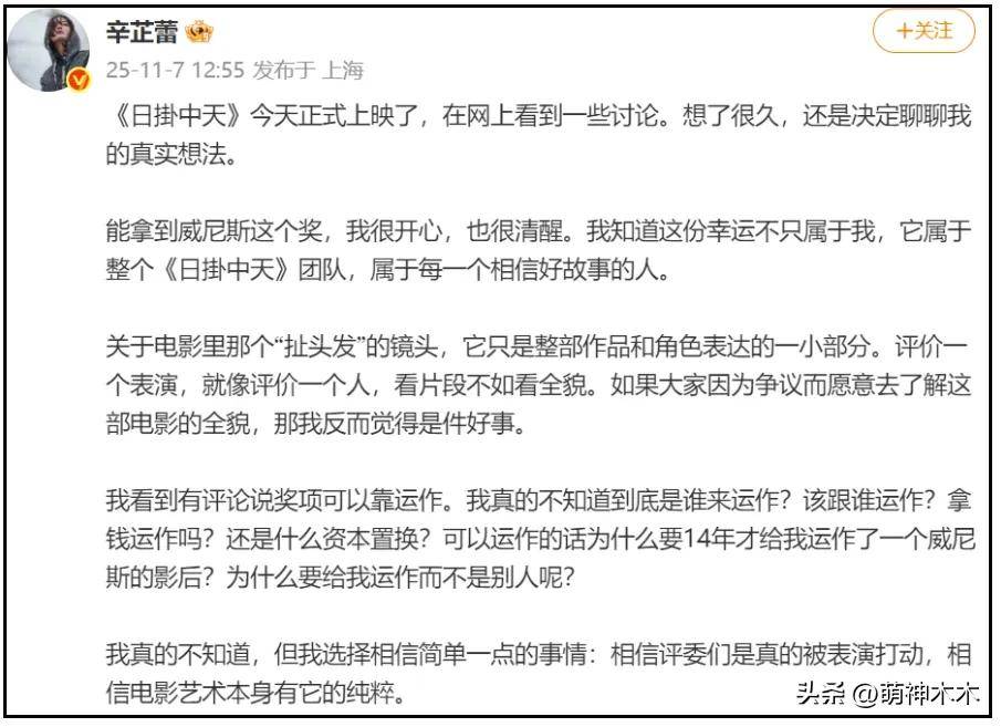 《日掛中天》能吸引大范围关注,离不开辛芷蕾凭借该片获得威尼斯影后这一殊荣。正因如此,许多影迷早早期待着影片的上映,迫不及待地想要一睹这位影后在银幕上的风采。然而,就在影片上映的当天,网络上曝光了『郝蕾』的朋友圈截图。截图中,『郝蕾』不仅批评了各大电影节,还暗指辛芷蕾的威尼斯影后奖项的“含金量”,言辞中充满了质疑。许多网友纷纷猜测,『郝蕾』是不是提前看过了电影,才会如此评论?