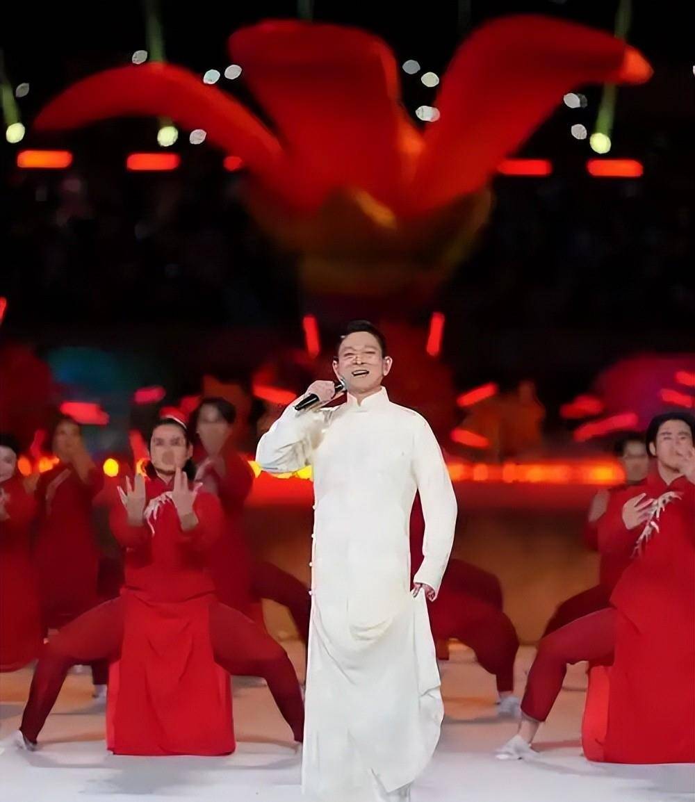 六十多岁的他,作为压轴嘉宾登台,一身白色唐装,精神奕奕。虽然脸上有了岁月的痕迹,但歌声依旧沉稳有力,一开口,就有一种“国泰民安”的踏实感。