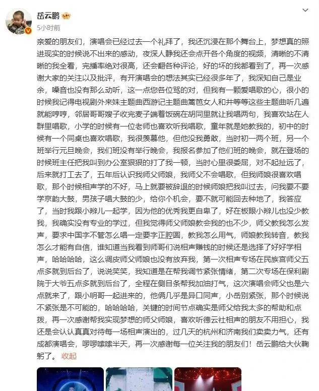 最近,相声演员岳云鹏开了场演唱会,这事儿在网上闹得沸沸扬扬。很多人吐槽他唱歌跑调、忘词,还说票价定得高,比一些专业歌手还贵。但在一片质疑声中,他却在『社交平台』上发了篇长文,坦诚地说自己确实不是专业歌手,嗓音也不够好,可就是喜欢唱歌。