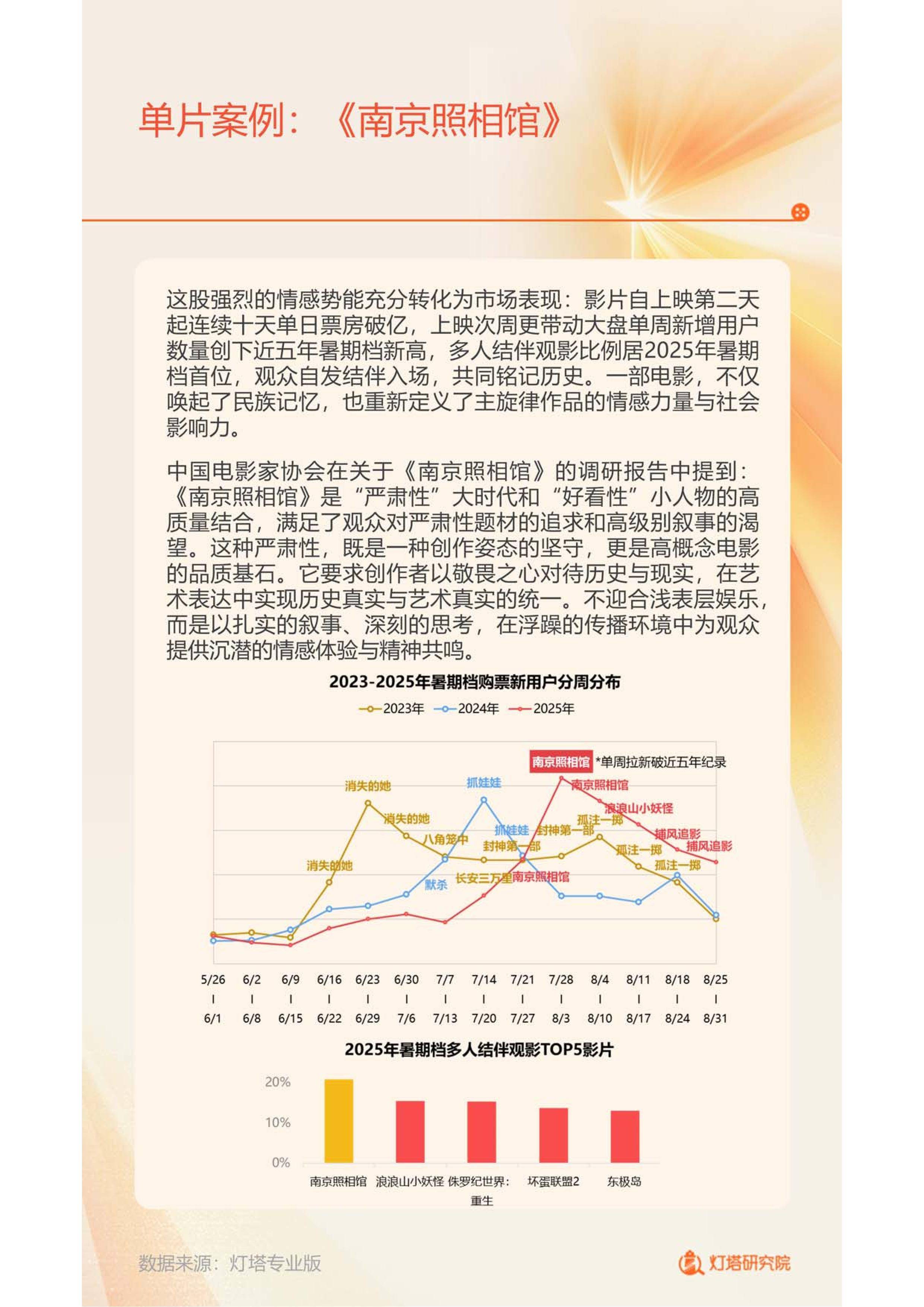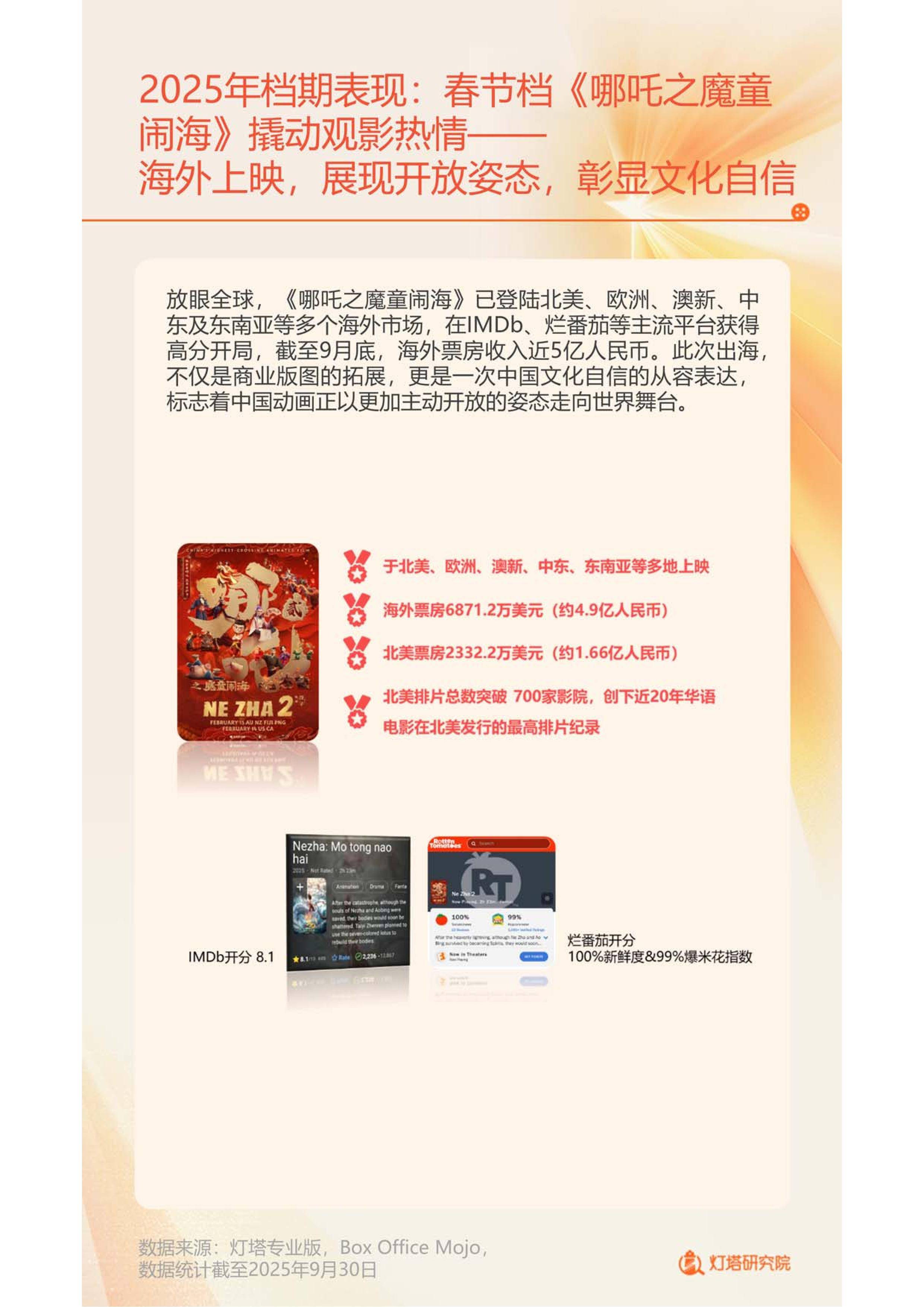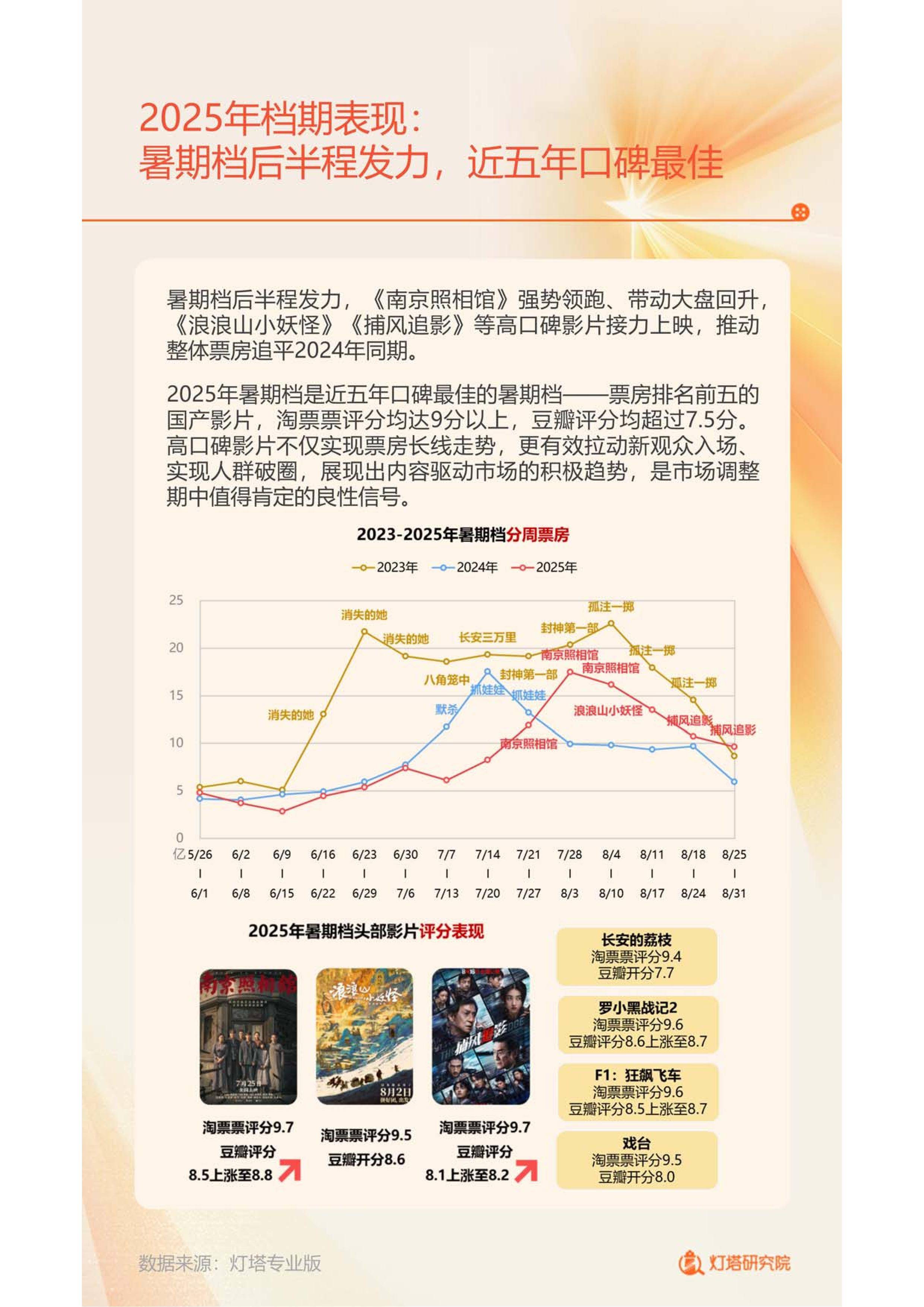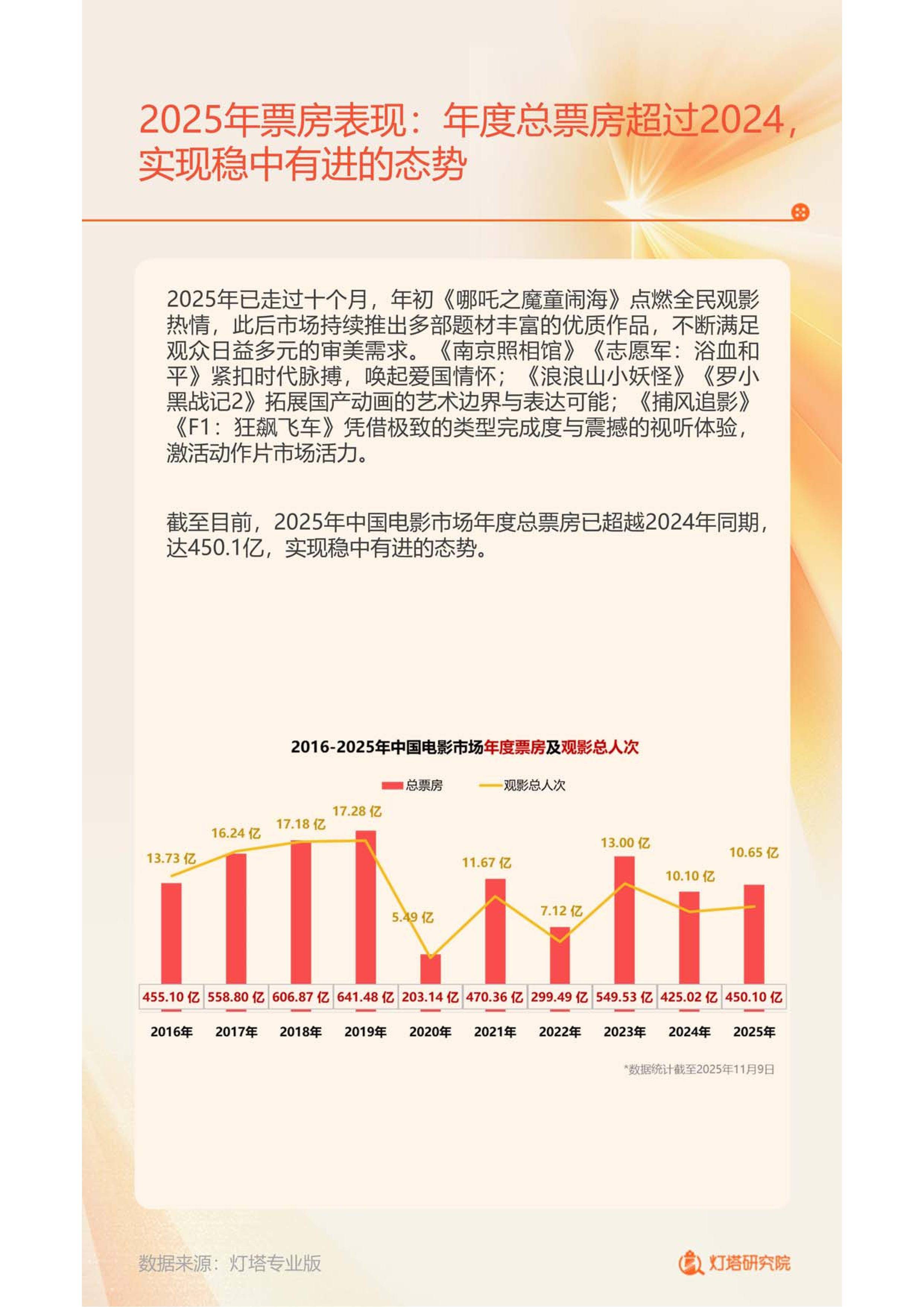 2025年的中国电影市场在理性调整中实现稳中有进,年度总票房截至11月初已达450.1亿元,超越2024年同期。现象级动画《哪吒之魔童闹海》以154.46亿元刷新国产电影票房纪录,并成为首部冲击全球影史TOP10的华语影片,不仅点燃全民观影热情,更彰显文化自信。与此同时,《南京照相馆》《捕风追影》等高口碑作品接力上映,推动暑期档成为近五年口碑最佳档期,印证了“内容为王”正成为市场主旋律。