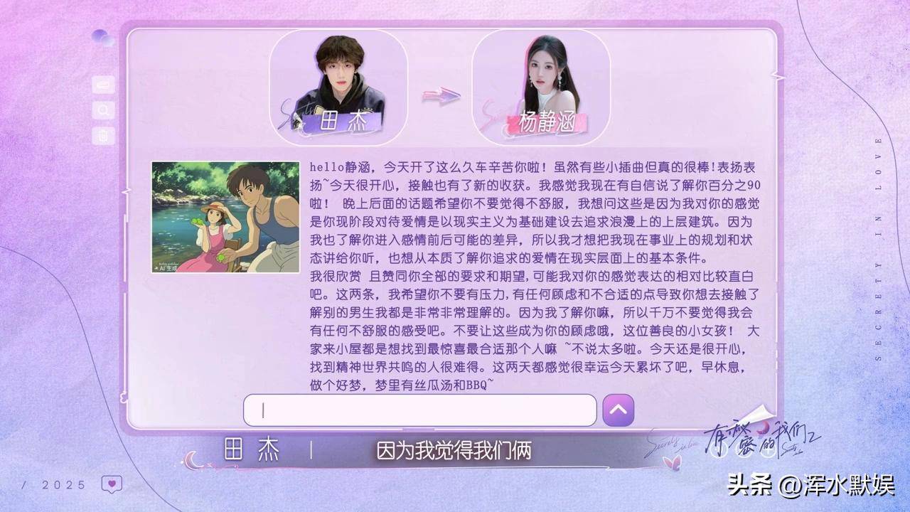 随着两人逐渐互动,田杰对杨静涵产生了好感。我曾经以为,基于两人看起来性格迥异,他们可能会发生冲突。但随着节目更新,我对田杰的看法发生了改变。反而让我发现,田杰在整个节目中,是最尊重女性♀️的男生之一。这种尊重可以从三个方面明显看出。