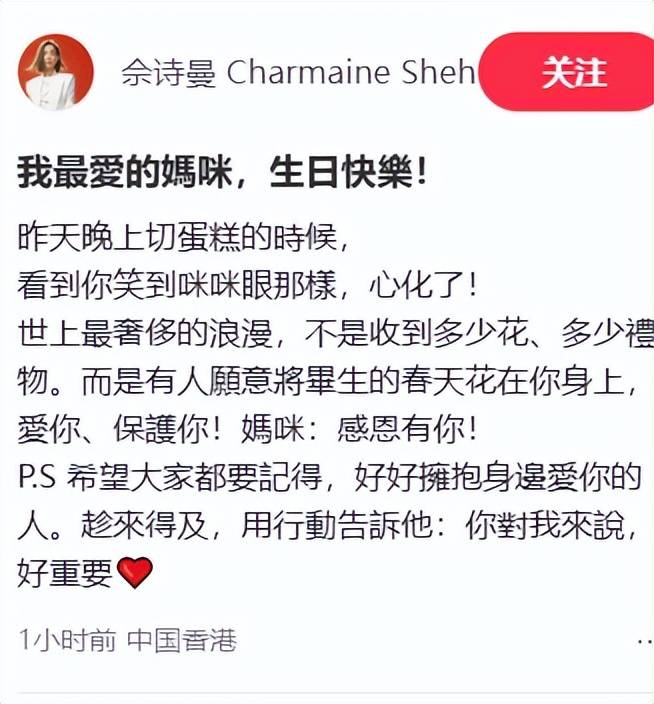 前几天还在许绍雄追悼会上哭到眼睛红肿的佘诗曼,转眼就换上温柔笑脸为妈妈庆生了。这种反差就像突然从阴雨绵绵的片场切换到阳光明媚的客厅,任谁看了都要心头一软。她配的那段文字特别戳人:"世上最奢侈的浪漫,是有人愿将毕生春天花在你身上"——这哪是普通祝福,分明是经历过生死离别后淬炼出的生活智慧。