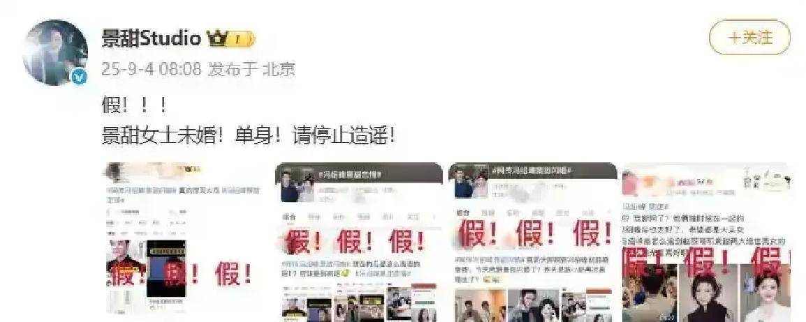 然而这并不是唯一一次传闻围绕冯绍峰。2025年9月,有娱乐账号发文声称他与『景甜』因合作而发展成恋人,并低调领证。流言一出,四处扩散,但『景甜』的团队直接用九宫格“假”字回应,语气极其坚定,还特别强调她单身。冯绍峰的团队也跟进否认,明确表示不信谣、不传谣。这场事后被证实完全没有事实基础的闹剧,就这样收尾。