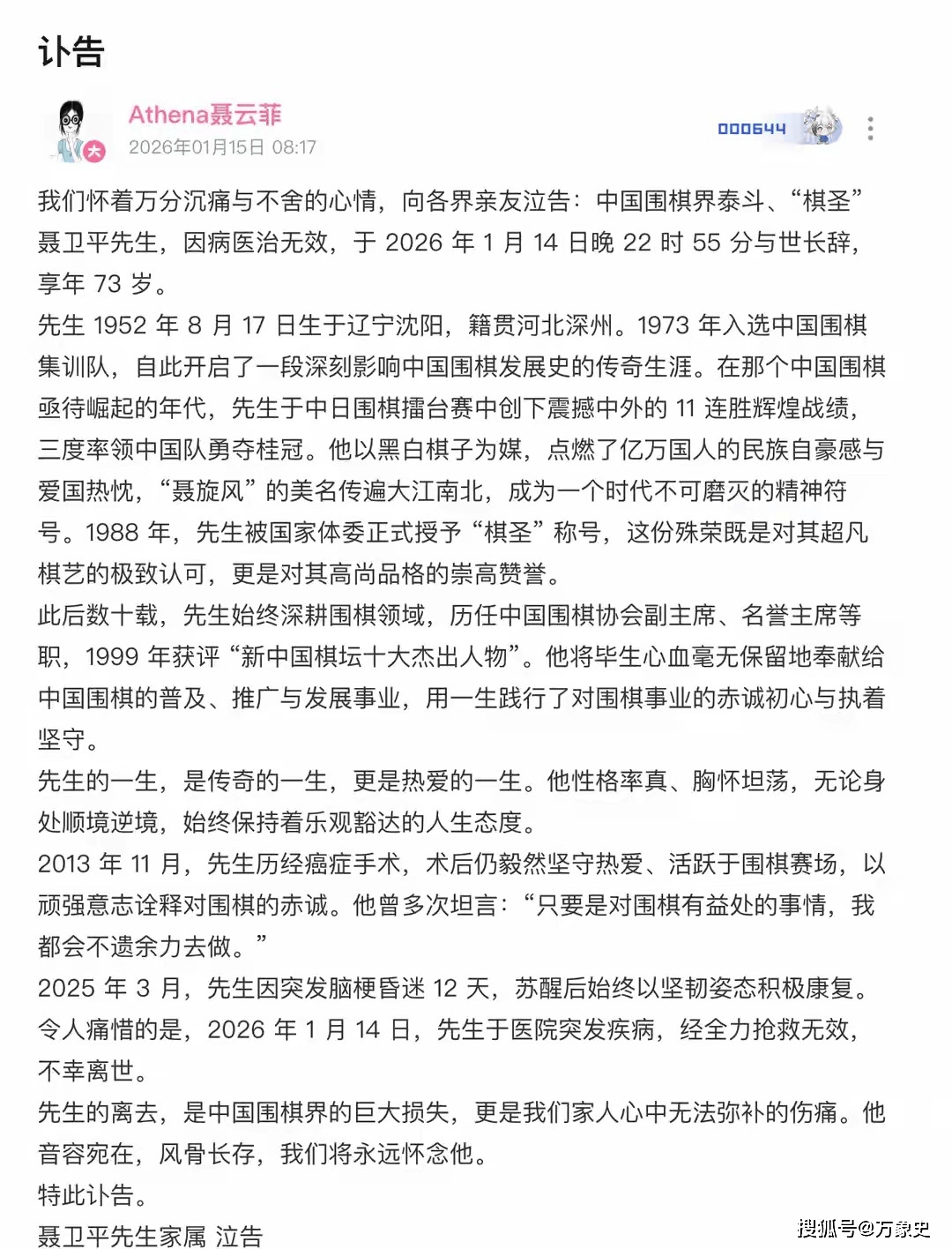 “棋圣”聂卫平因病抢救无效,不幸离世,终年74岁。