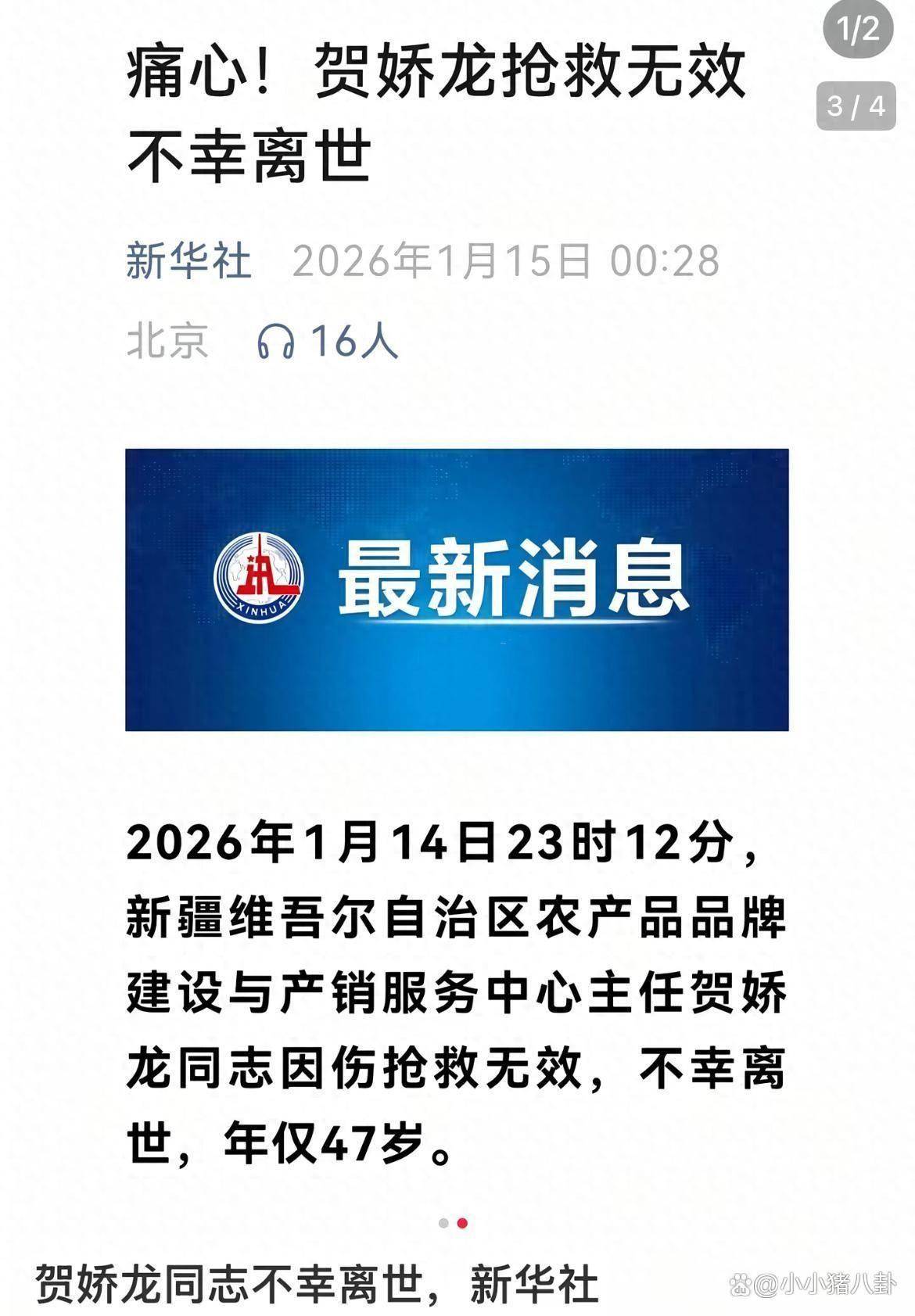 1月14号晚上11点12分,贺娇龙走了。抢救无效,终年47岁。消息是今日霍州发的,一句话,却让太多人眼泪止不住往下掉。她不是『明星』️,却是无数人心中的光。那些曾经在『直播间』里跟着她买昭苏牛肉、看草原风光的人,突然发现,那个穿红斗篷策马奔腾的女人,再也回不来了。