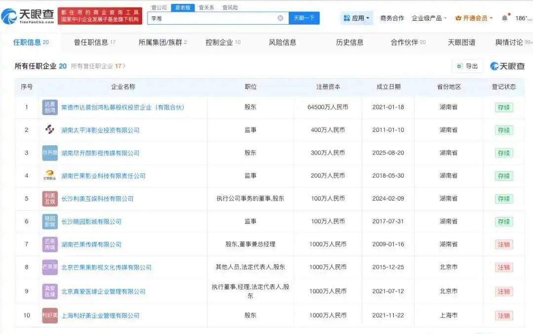 更怪的是她名下公司的变化,据天眼查资料显示,『李湘』关联的企业有20家,里面有14家已经注销完毕,剩下的只有6家还在正常运营中。