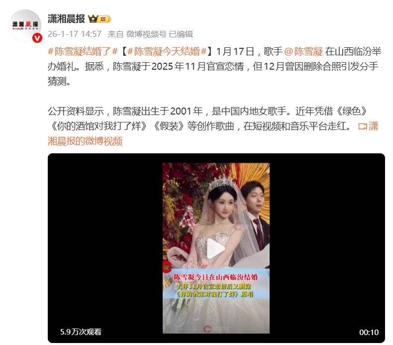 1月17日,歌手陈雪凝在山西临汾大婚的消息,瞬间冲淡了此前关于她分手的种种猜测。从官宣恋情到删除合照引发猜疑,再到如今直接举办婚礼,这一波“删照-闪婚”的极限操作,让网友直呼“剧情反转太快,像坐过山车”。