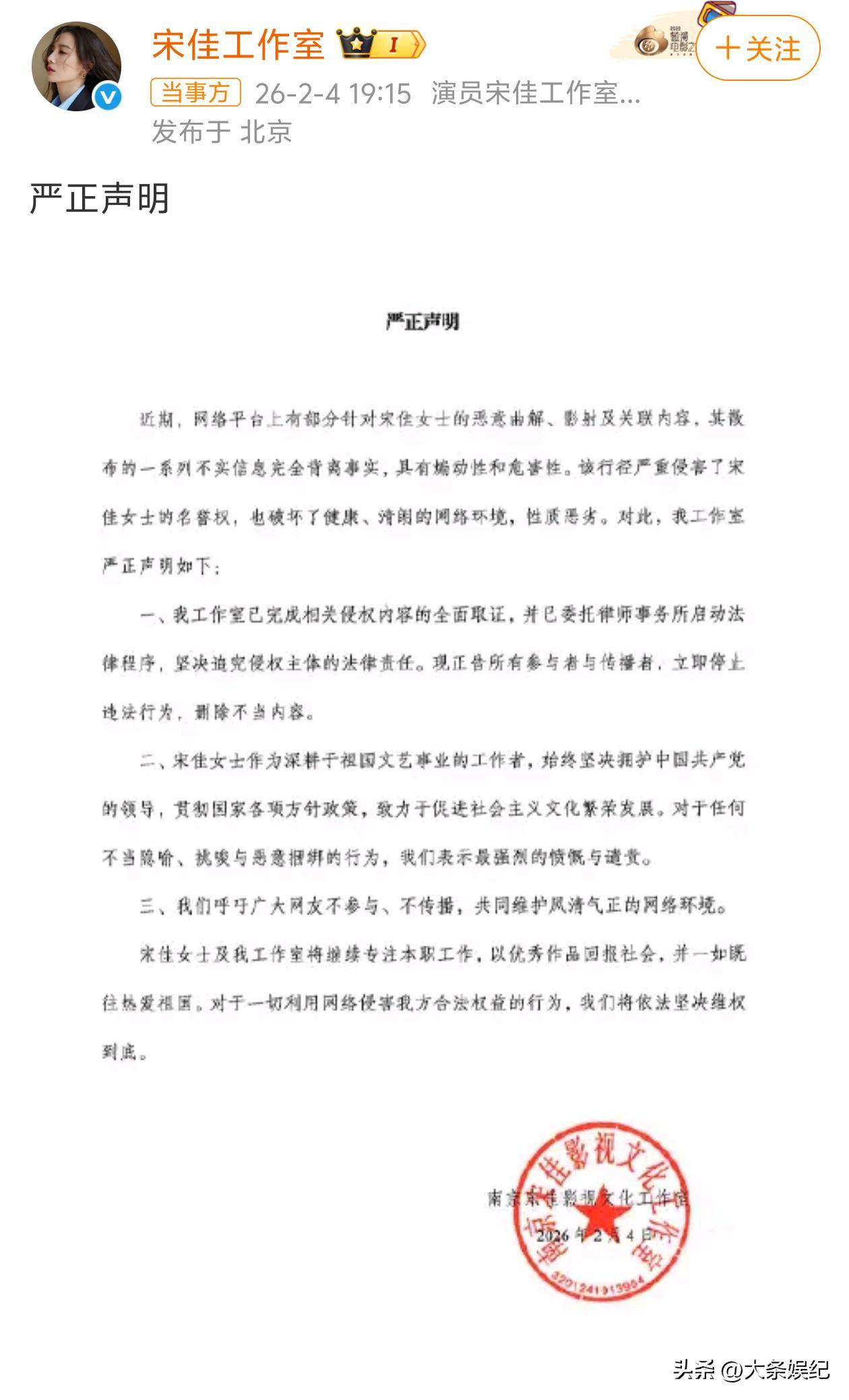 面对这种舆论风波,『宋佳』的工作室迅速发布了声明回应,明确表示这些指控完全是无中生有,性质极其恶劣,已经对相关言论进行了取证,并强烈警告⚠️那些发布谣言的人立刻删除其不实言论。工作室表示,这些恶意的捆绑和曲解,不仅侵犯了『宋佳』的名誉权,也让她感到无比委屈。