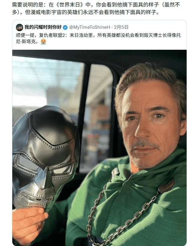 另一位爆料人 MyTimeToShineHello 则补充了更具体的细节。他表示,影片将刻意回避毁灭博士与托尼·斯塔克之间的外貌相似性。按照传闻设定,电影宇宙中的角色将始终无法看到毁灭博士面具之下的真实面孔,也不会意识到他与钢铁侠在长相上的一致。