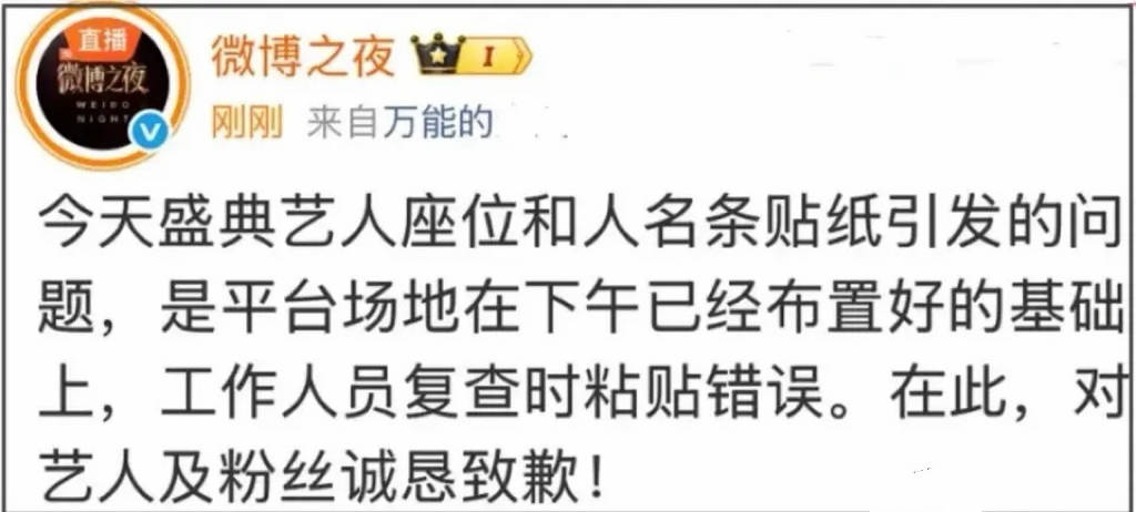 『杨幂』工作室率先向主办方“讨说法”,微博之夜官方发文表示:平台场地在下午已经布置好的基础上,工作人员复查时粘贴错误,对艺人及粉丝诚恳道歉。