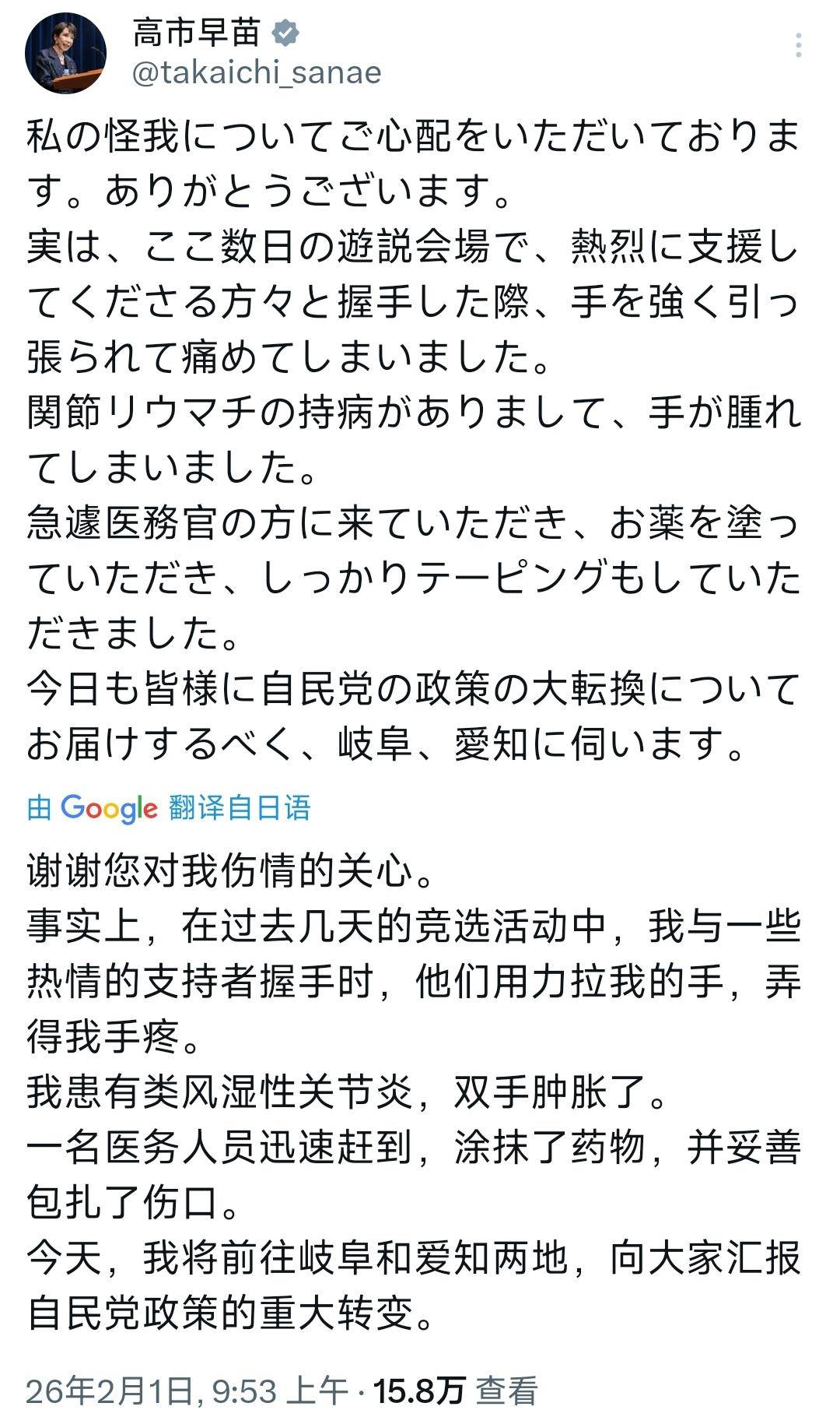 节目组随后解释,接自民党方面通知,高市因在助选活动中手臂受伤,正接受治疗。田村宪久还进一步透露,高市手部早有不适,助选时被支持者用力拉拽,导致受伤。高市本人甚至在『社交平台』详细补充,说是过去几日在助选现场与热情支持者握手时,手臂被用力拉拽,加上自己患有类风湿关节炎,手部已经肿胀,目前已妥善包扎固定。