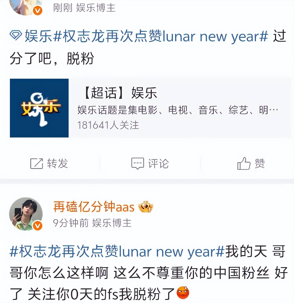 更让网友没想到的是,他的新年风波还能有后续,在网友骂声一片的情况下,又默默点赞了一个lny的动态,从暗暗内涵变成明的挑衅了。