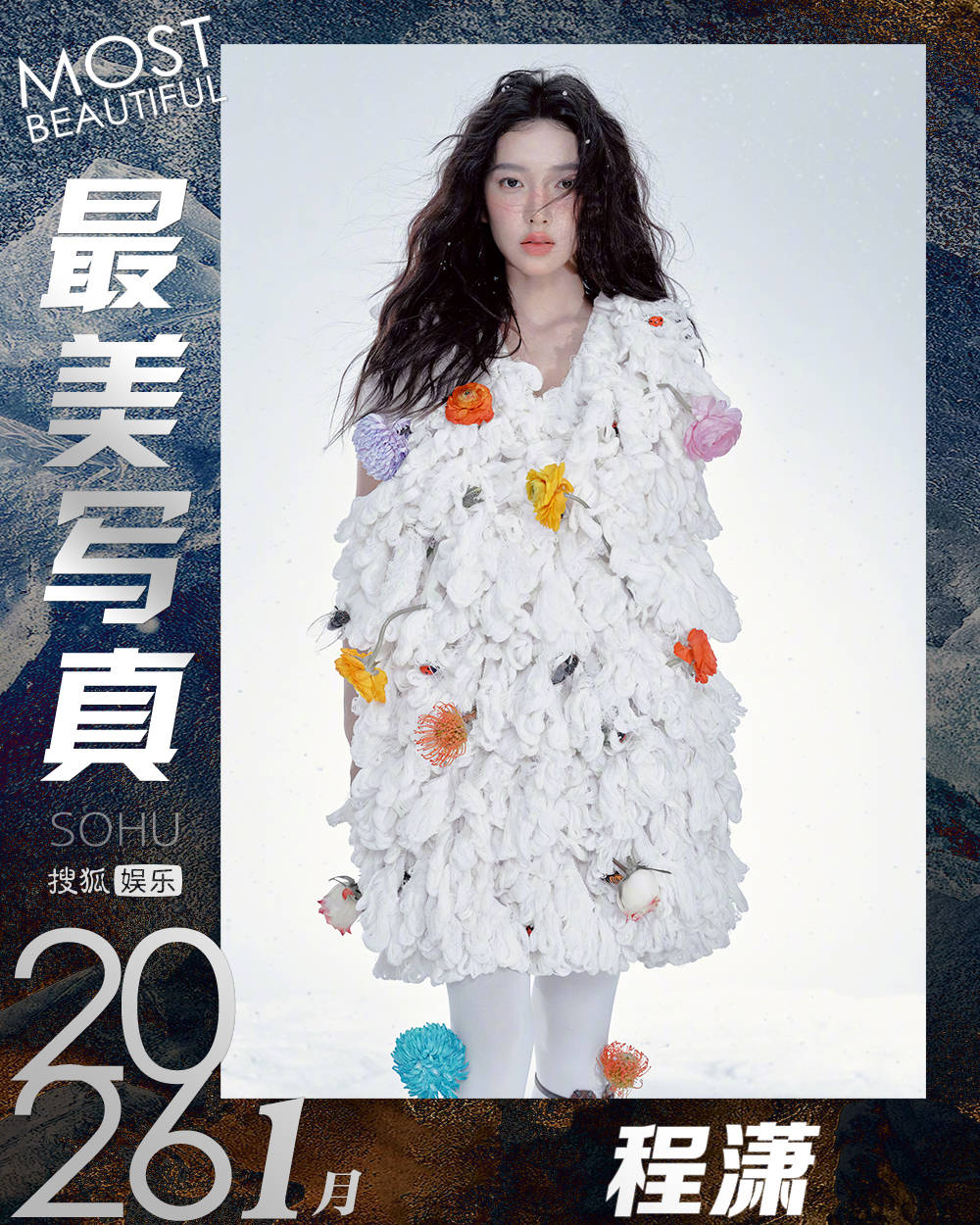身穿白色裙装的『程潇』置身于无垠的雪地,漫天飞雪如碎钻般飘落,她的裙身与长靴上缀满了色彩浓烈的仿真花,色彩缤纷的话多在纯白天地间肆意绽放,像一场被定格的春日幻梦。她的眼神里带着少女的澄澈,又有着一丝疏离冷感,在冰雪的凛冽与繁花的热烈间,释放着属于她的时尚嗅觉。