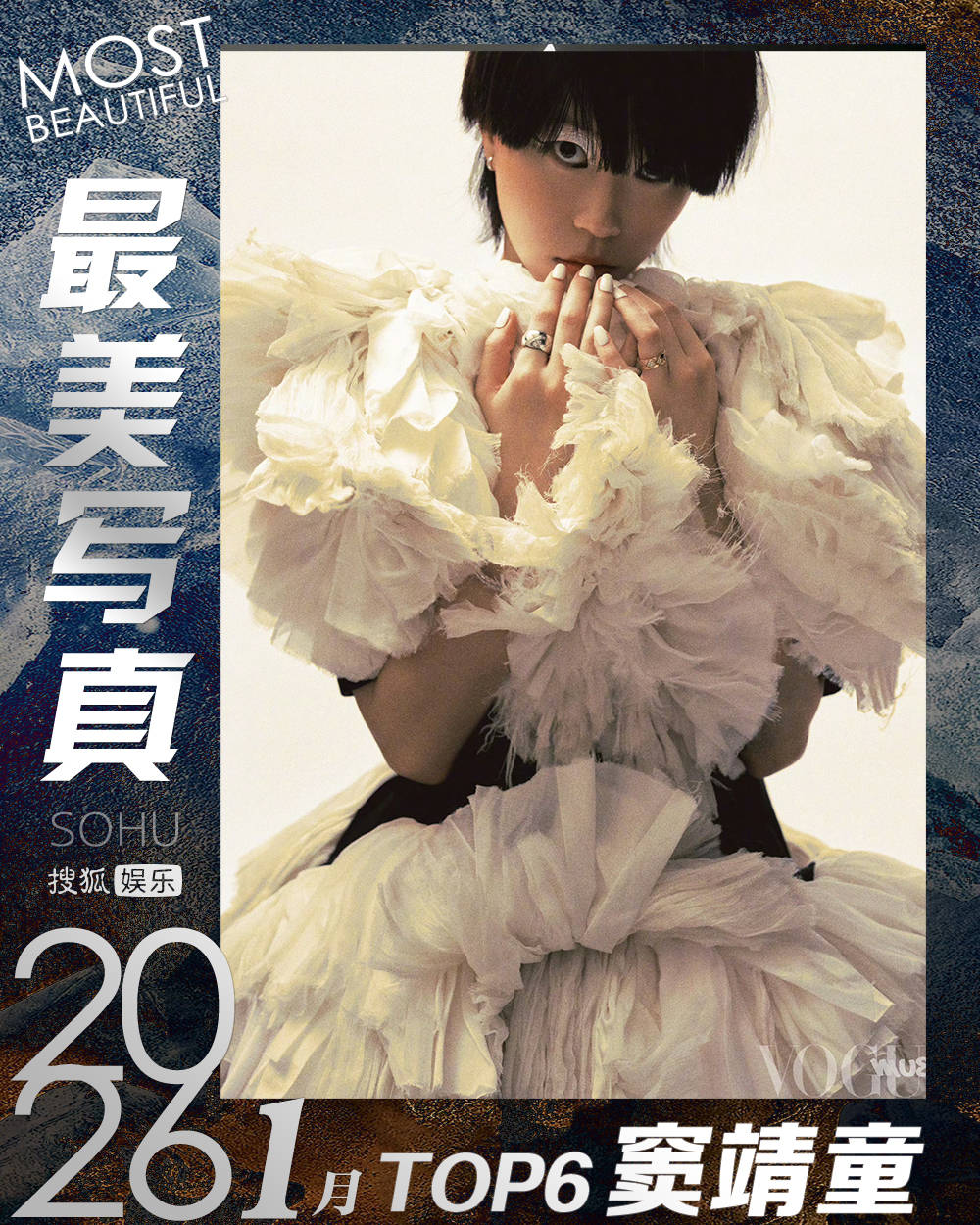 窦靖童这组大片完美演绎了何为刚柔并济。她身着一件极具先锋感的白色层叠褶皱礼服,蓬松的肌理面料似花瓣一般,在柔和的暖调光线里呈现出轻盈又富有雕塑感的视觉效果。黑色腰封在柔美的面料中加入了利落的线条,让整体造型既有浪漫氛围,又不失力量感。相较于柔美的礼服,窦靖童一头利落的短发,眼神专注而清冷,恰好诠释了她独有的 “酷感与诗意并存” 的个人风格。