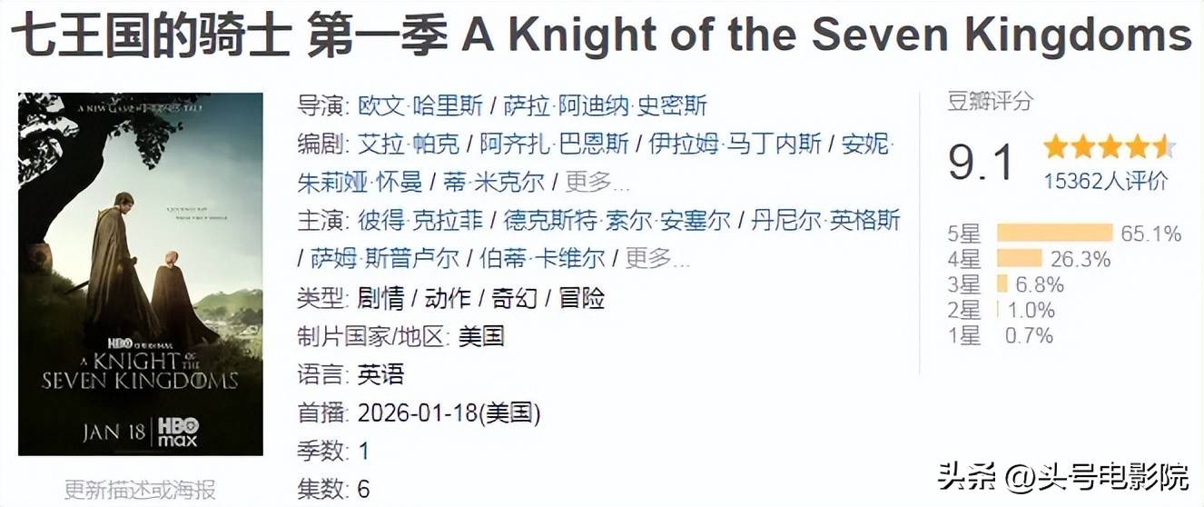 七王国的骑士》。这部剧刚刚播完了第一季的结局,豆瓣评分高达9.1分,IMDb单集评分普遍达到9.5以上,尤其是第五集《
