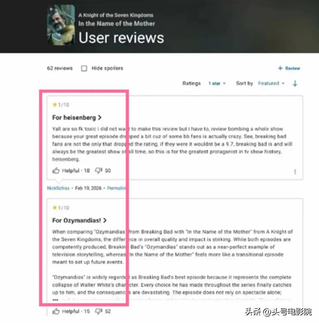 绝命毒师》的神级集数发起了1星攻击。这一轮互刷操作,导致Ozymandias从稳坐10分的宝座,直接滑落至9.8分,排位也从历史第一下滑到第九。随着这些操作的继续,分数又继续下降,最终逼近9.6分。