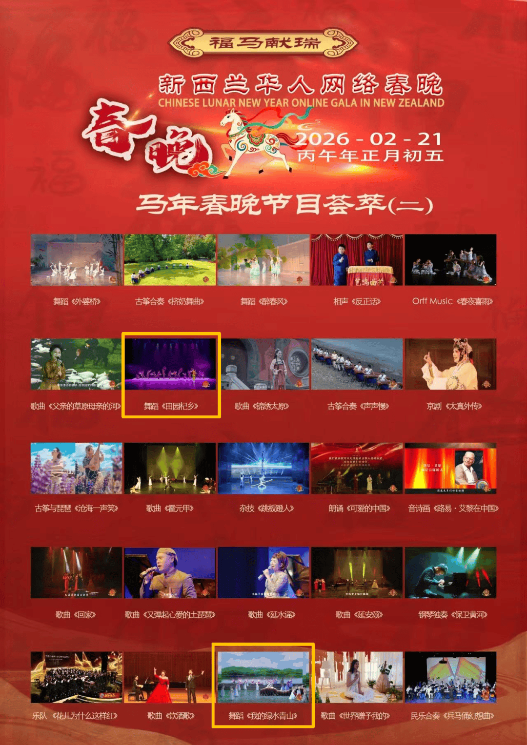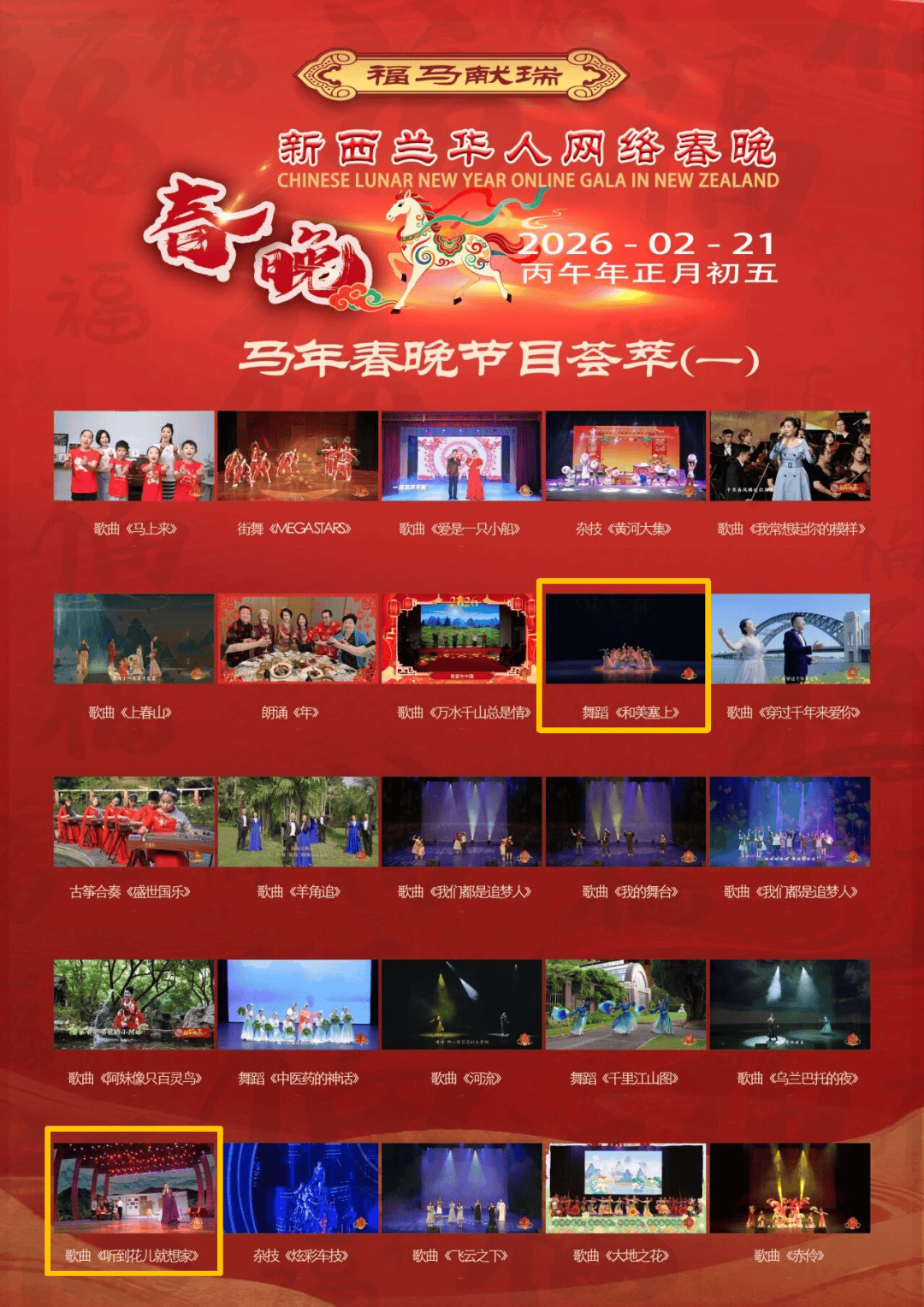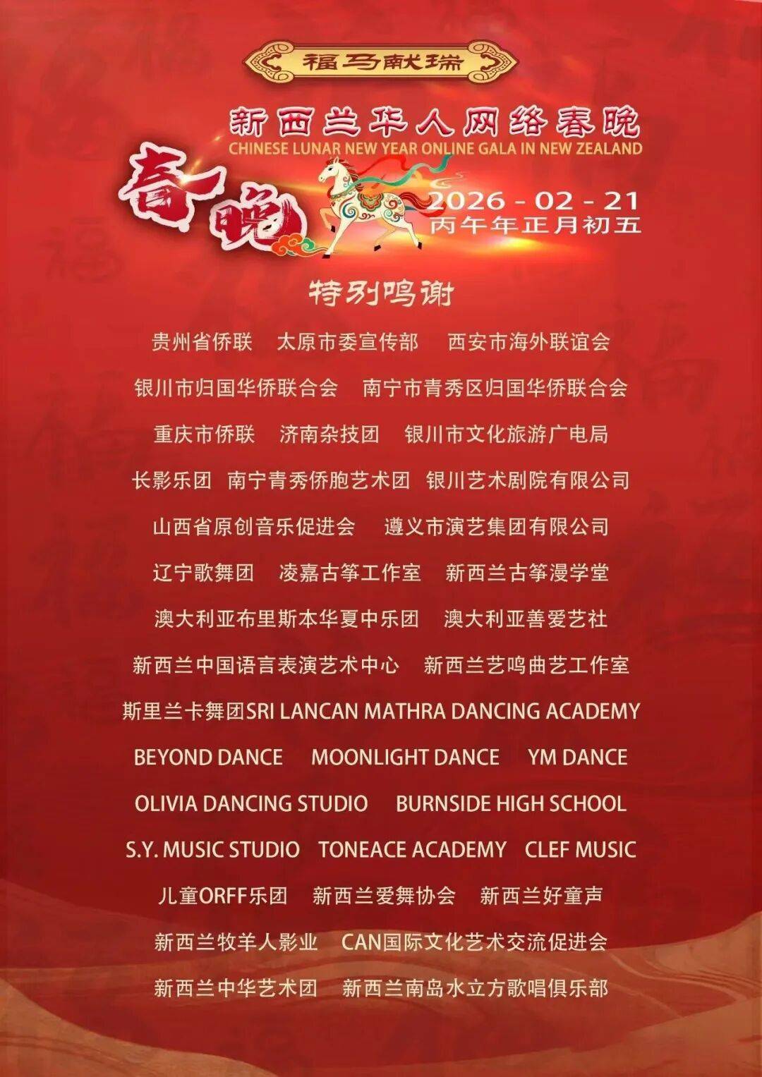 近日,由新西兰新中文化交流协会主办的2026马年新西兰华人网络春晚成功举办,晚会通过海外媒体平台全程直播,为海内外观众献上一场精彩纷呈的新春文化盛宴。其中由银川市侨联联合银川艺术剧院有限公司精心选送的《和美塞上》《我的绿水青山》等4个富有宁夏地域特色与家国情怀的文艺节目亮相本届网络春晚,用艺术搭建桥梁,以乡音联结乡情,向新西兰广大华侨华人传递新春祝福。