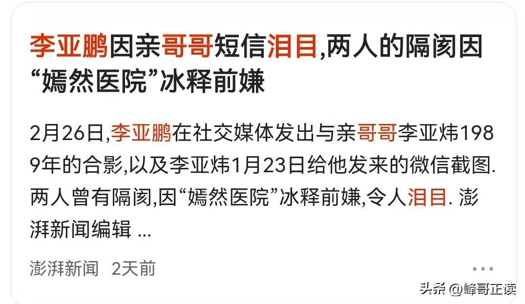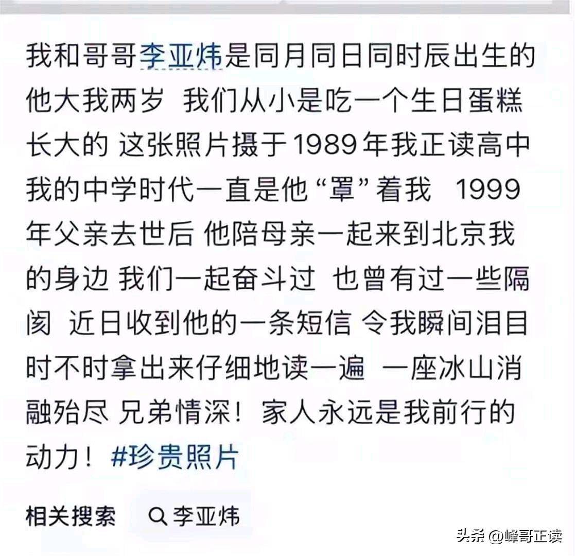 2月26日,正是兄弟俩的共同生日,李亚鹏在『社交平台』上发布了几张照片,其中一张是1989年两人并肩站立的黑白照片,另一张则是哥哥发来的微信长文截图,配上文字:一座冰山消融殆尽,兄弟情深。这标志着李亚鹏与哥哥李亚炜经过长达十几年的冷战与误解后,终于重新和解。