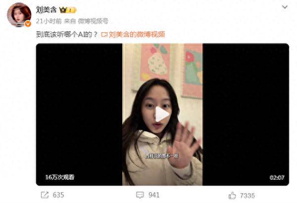 刘美含表示,如今大家习惯遇事问AI,但AI答案未必准确,自己也彻底懵了,不知该信谁。