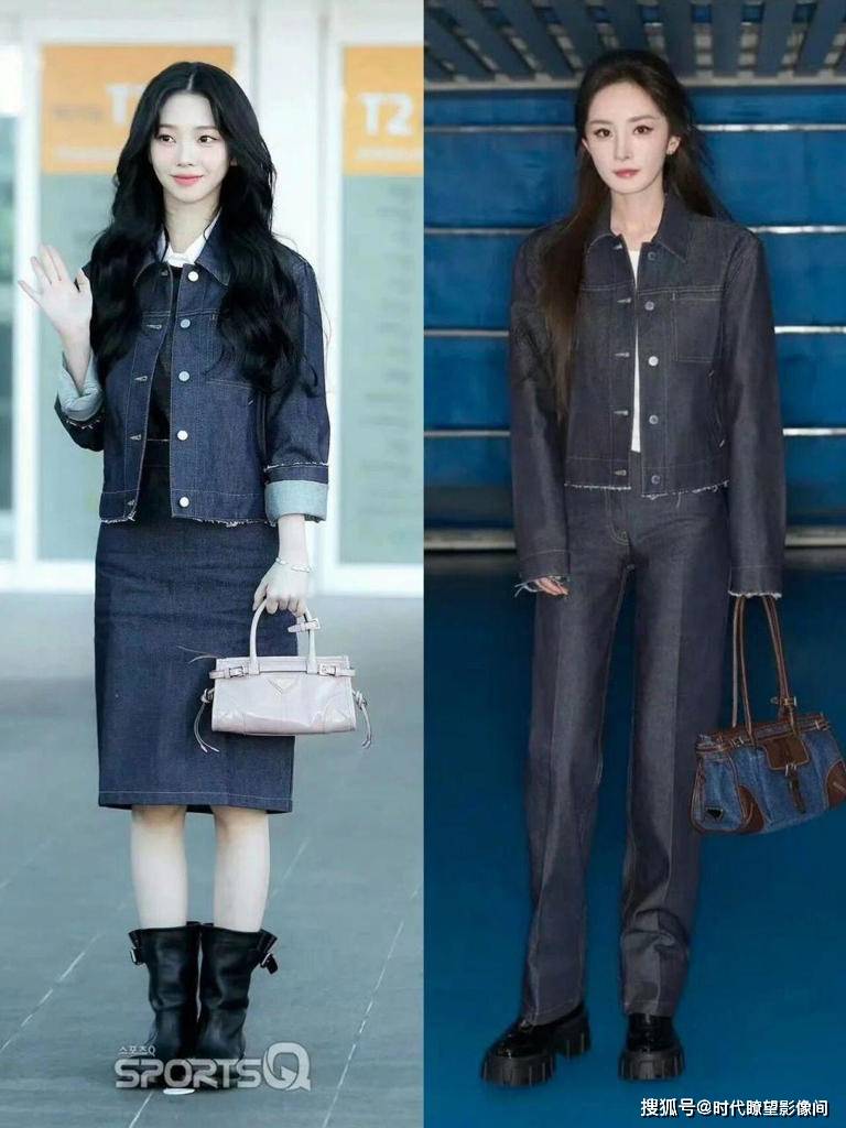 事情起因是 Prada 『时装周』,作为品牌代言人的两人先后撞衫了同款深色牛仔套装:『杨幂』先出发穿了全套,干练飒爽;柳智敏第二天穿同款上衣现身机场,多了点少女娇俏。本来就是品牌主推款,结果粉丝直接炸了 —— 『杨幂』粉丝说柳智敏 “蹭热度登月碰瓷”,柳智敏粉丝回怼 “又白又美小年轻秒了『杨幂』”,直接把 “抄袭说” 吵上热搜。