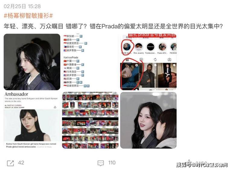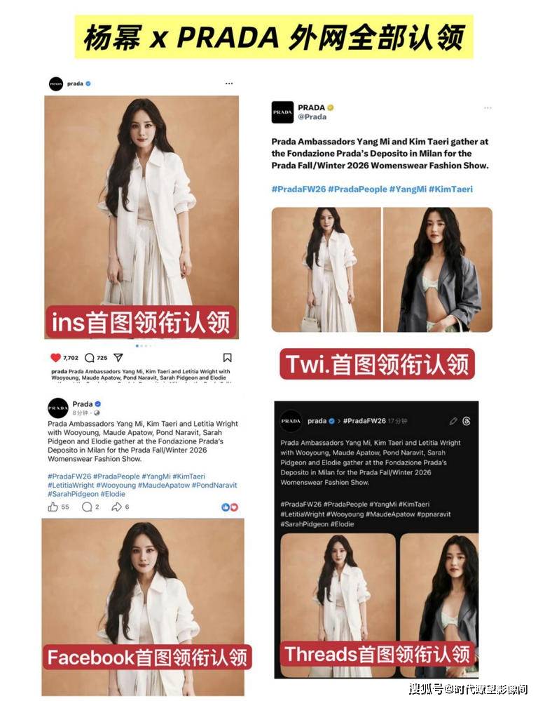 这还不算完,粉丝紧接着又开始 battle 品牌待遇:柳智敏粉丝先放锤,说她是秀前唯一单独预热的艺人,座位在黄金 A 区和谷爱凌同排,中间还坐了品牌 CEO;『杨幂』粉丝不甘示弱,甩出秀后品牌外网全平台 “首图 + 领衔” 认领的证据,还扒出『杨幂』合作三个月就拿下定制礼服、VOGUE 封面,广告线下刷屏,Prada 简直把她宠成亲闺女。