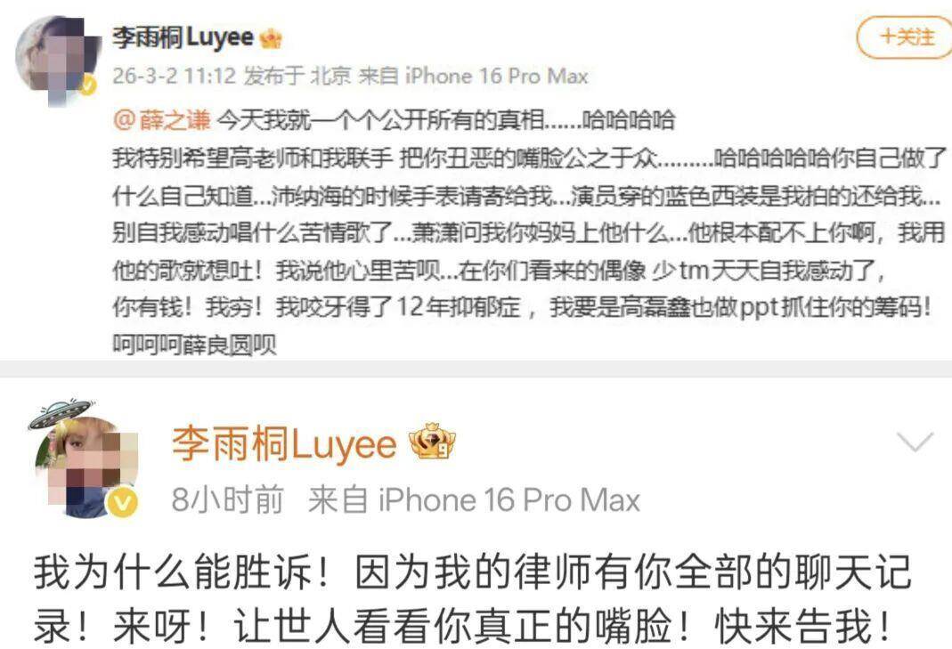 2017年9月,『薛之谦』在高调宣布与高磊鑫复合后,李雨桐首次开撕,连续发布长文,指控『薛之谦』“骗财骗色”、让自己堕胎,并晒出合同、转账记录等证据,那场“求锤得锤”的大戏曾轰动一时。 随后双方陷入长达数年的互相起诉,官司涉及名誉权、合同纠纷等多个方面,过程反复,『薛之谦』曾多次撤诉,法律层面并未给出一个清晰的胜负论断。