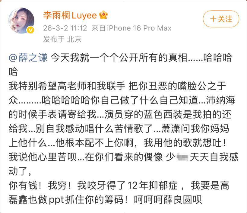 紧接着,李雨桐就像个发了疯的工作室账号,连着狂飙了20多条微博,那架势,恨不得把过去十年的委屈全吐出来。她不仅喊话要公开所有真相,把『薛之谦』“丑恶的嘴脸公之于众”,还特逗地要求人家归还手表、西装这些零零碎碎的物件儿。我当时一看就乐了,你说你指控的都是“重婚”、“堕胎”这种要人命的大罪,怎么到头来还惦记着那点破衣服烂手表?这就像打仗呢,你扛着大炮冲到敌人阵前,结果喊的是“把上次借我的两块钱还我”,这画风不对啊!她还来了句“君子报仇,十年不晚”,感觉像是憋足了劲要放大招。