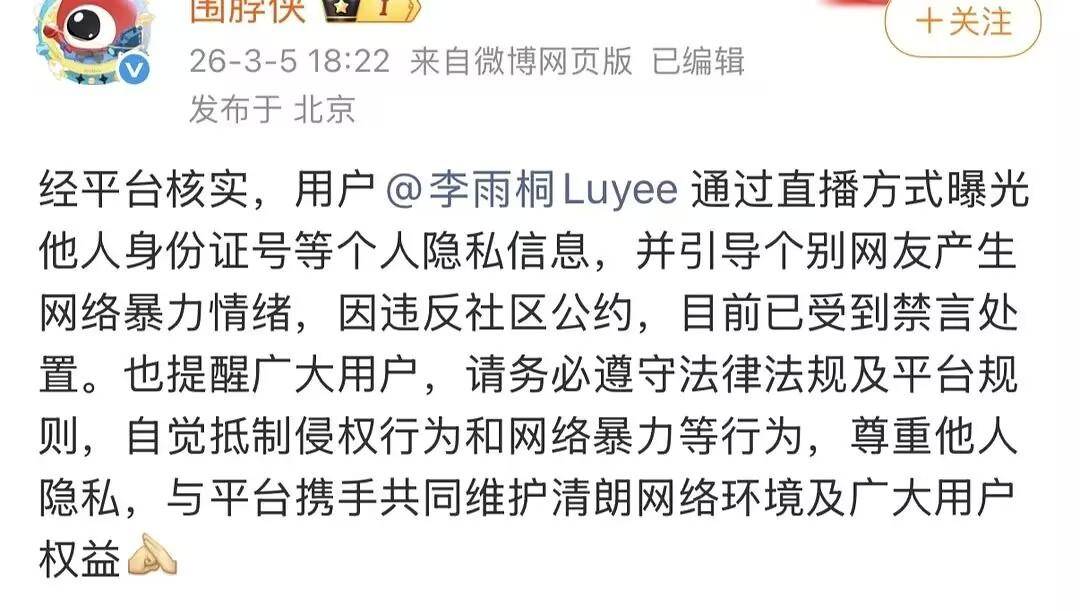 可结果呢?『薛之谦』那边倒是反应迅速,他那个经纪公司“潮石音乐”立马跳出来发声明,说这些都是“严重失实内容”,是“捏造对话内容挑起纷争”,是“恶意诽谤” 。这种公关辞令咱们见得多了,无非就是“不听不听,王八念经”那一套。真正让这出戏急转直下的,是李雨桐自己。据说这位姐觉得微博不过瘾,直接开了直播,在直播里干了件让所有人都惊掉下巴的事儿——她竟然把别人的身份证🪪号等个人隐私信息给抖搂出来了!这一下可捅了马蜂窝,3月5号,“围脖侠”亲自下场,一锤定音:因曝光他人隐私、引导网络暴力,李雨桐被禁言了。好嘛,这复仇的大旗还没扯起来呢,自己先被平台“红牌罚下”了,你说这事儿闹得,讽刺不讽刺?