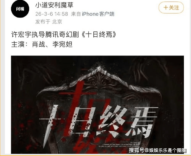 今天一大波认证账号突然集体“发功”,爆料说腾讯视频那个吊了大家好久胃口的S+级奇幻大剧——《十日终焉》,主演定了!谁?『肖战』!搭档谁?李宛妲!