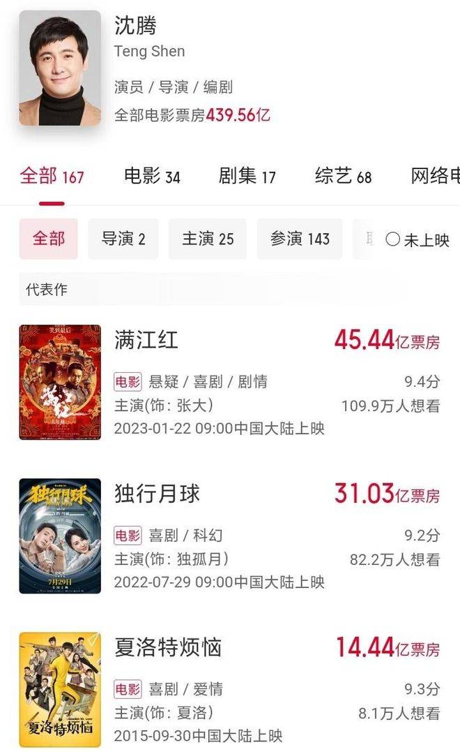 再来看看星爷『周星驰』。你翻开他主演的电影,像香港92年《审死官》5000万港元,内地04年《功夫》1.73亿……这两部合起来,足够『沈腾』的一部《李焕英》票房了吗?显然,差远了。有人可能会说:那是因为九十年代票价低,现如今一张票五六十。那我问你,时代给的机会,『沈腾』凭什么就错了?星爷赶上了香港电影的黄金时代,『沈腾』则赶上了中国电影的爆发期。每个人的机遇不同,各自凭本事吃饭,能怪谁?再说了,有人扯着说按观影人次算,『沈腾』的《李焕英》1.2亿观影人次,《满江红》9000万,而星爷所有片子的总观影人数,能有1.2亿吗?我看,恐怕连这一步也走不满。