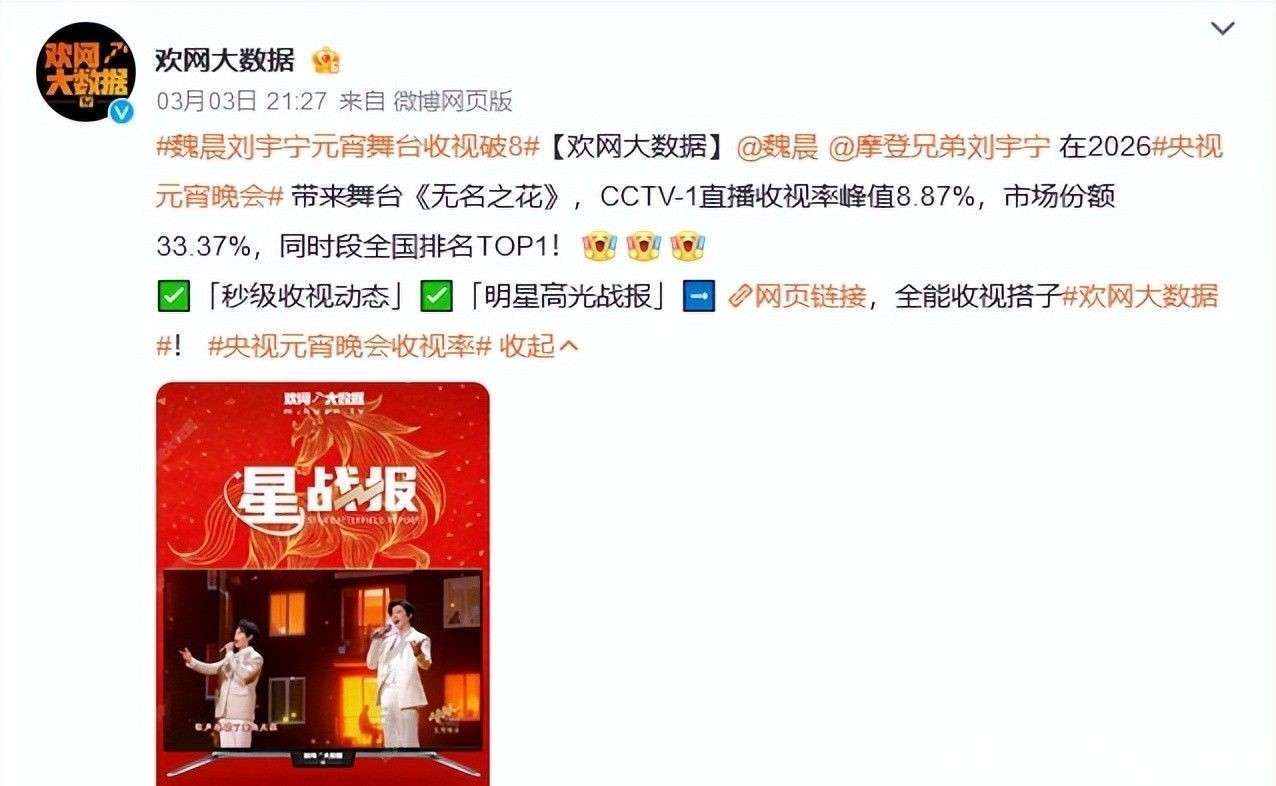 2026年中央电视台的元宵晚会在万众期待中圆满落下帷幕,整个晚会的综合收视率创下了7.86%的新高,打破了同类节目以来的传播纪录。舞台上星光熠熠,汇聚了无数经验丰富、技艺精湛的歌手们,他们的表现无懈可击,音准和节奏都精确到位。然而,令人意想不到的是,这些久经磨砺、履历辉煌的专业歌手,却在观众口碑和『社交媒体』热度上,竟然不及两位主攻影视领域的跨界艺人。